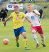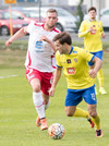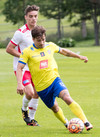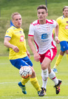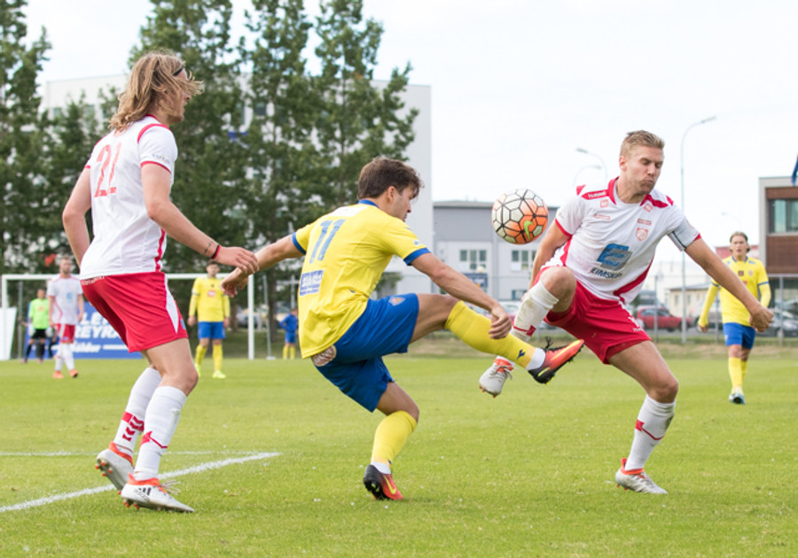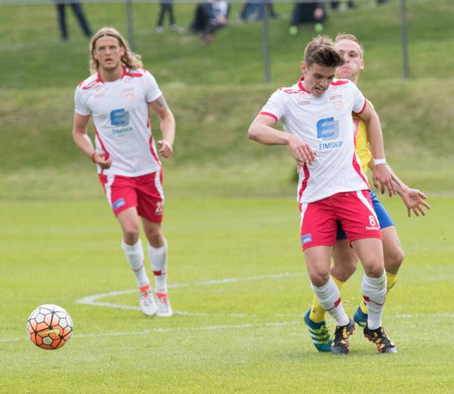 Gunnar Örvar með sendingu á Jóhann sem er sloppinn einn í gegn en er dæmdur rangstæður