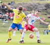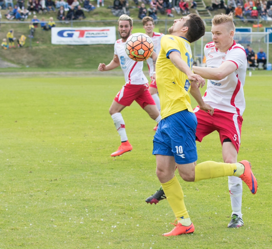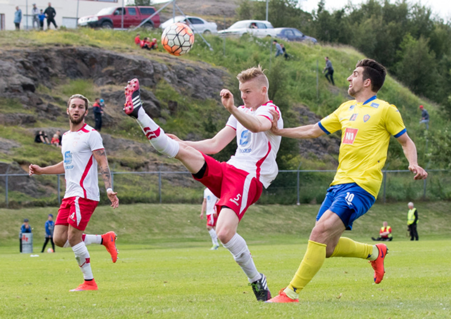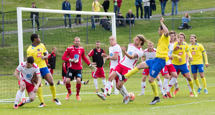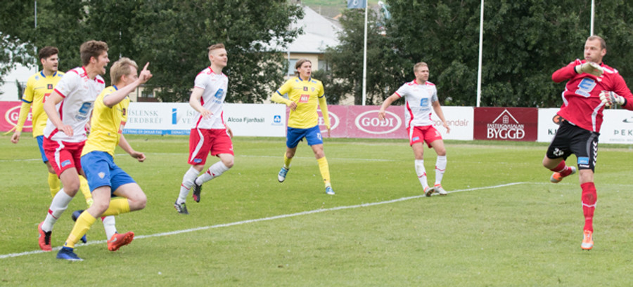 Eftir fína sókn á Sveinn Elías fyrirgjöf á Jónas sem skallar boltann á markið. Rjako gerir vel í að skutla sér og ná til boltans. Fyrsta almenninlega færi þeirra í seinni hálfleik