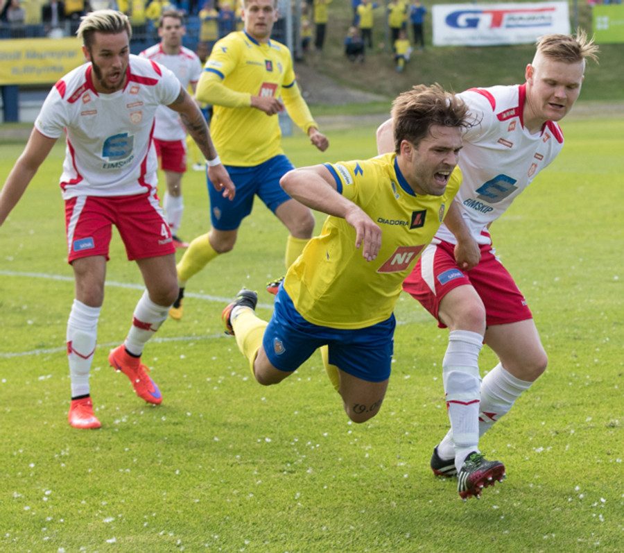 Þórsarar skora eftir aukaspyrnu en markið réttilega dæmt af þar sem Jóhann Helgi stekkur inn í Rajko sem liggur hér eftir