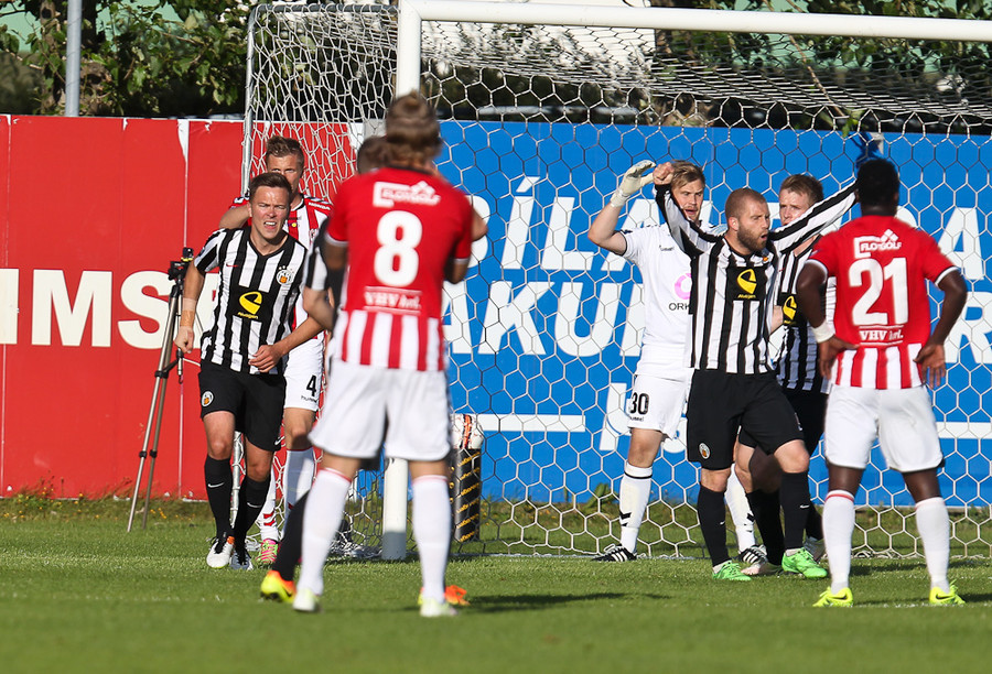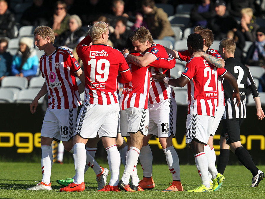 Daninn Christian Sörensen stingur boltanum á Dion Acoff sem gerir vel og kemur boltanum inn í teig þar sem Björgvin bíður. Björgvin skýtur fyrst í Stefán Loga en fylgir svo eftir og setur boltann í autt markið.