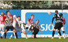 Vilhjálmur Pálmason liggur eftir viðskipti við Præst í loftinu. Præst fór með olnbogana út og greinilega í hausinn á Vilhjálmi.