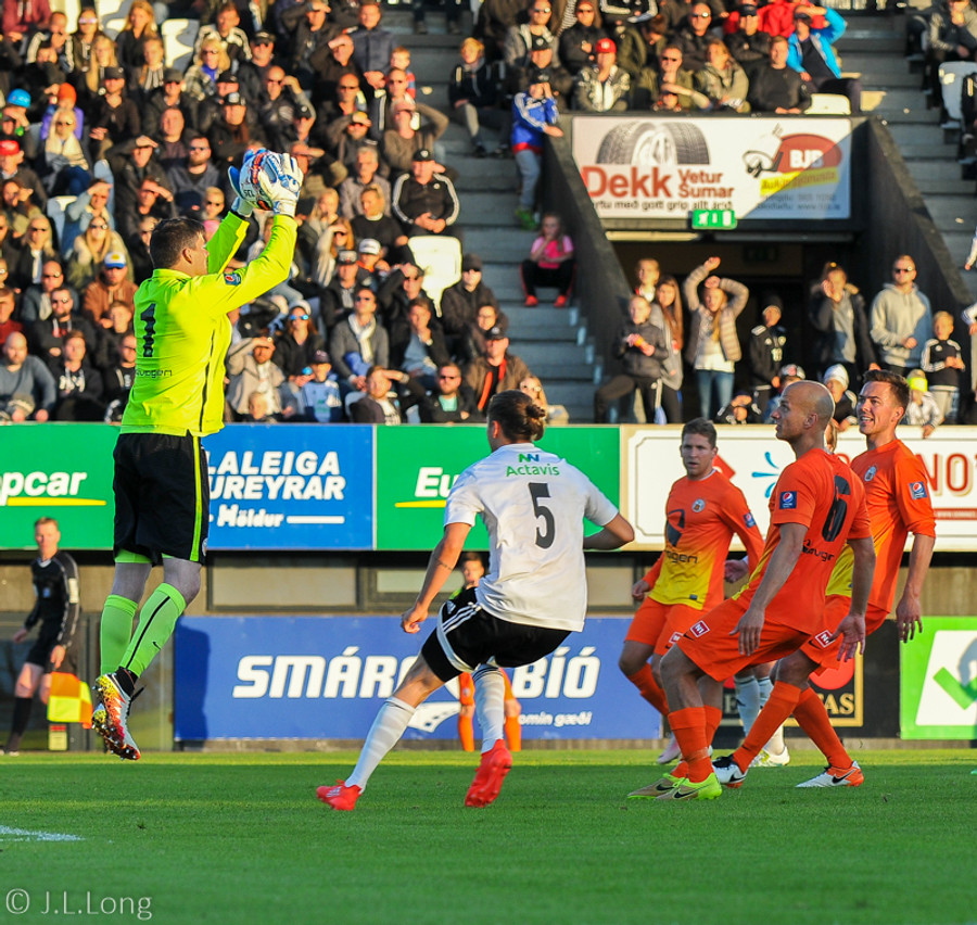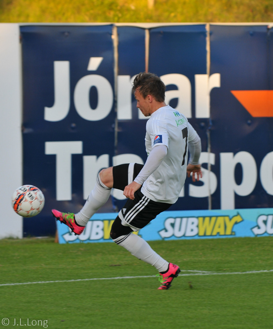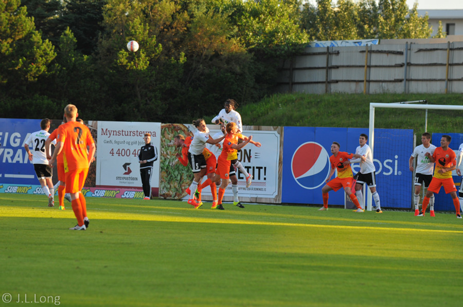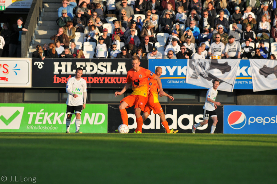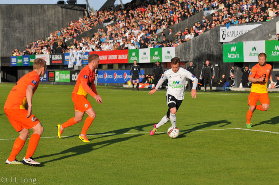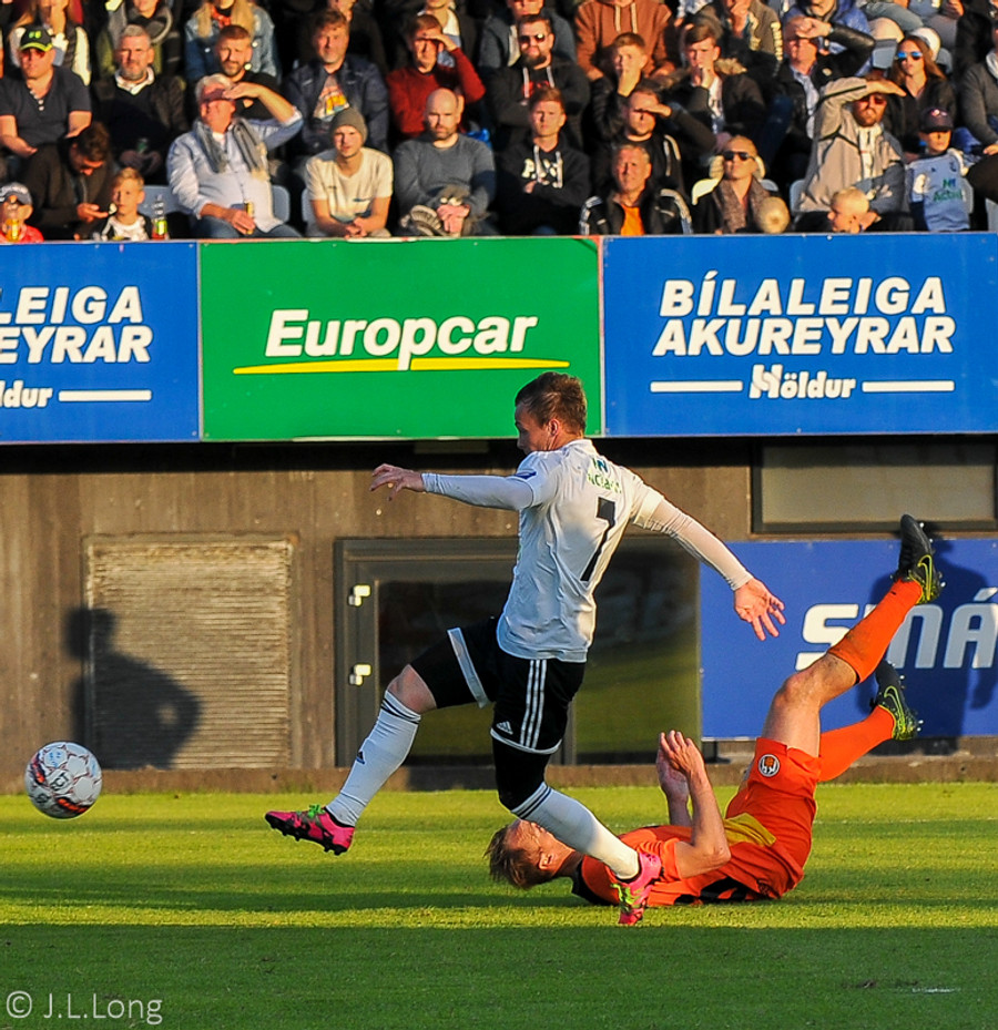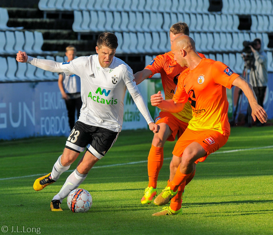 Steven Lennon vinnur boltann af Aroni Bjarka og geysist inn á teiginn vinstra megin. Indriði stöðvar för hans með góðri tæklingu. Hornspyrna.