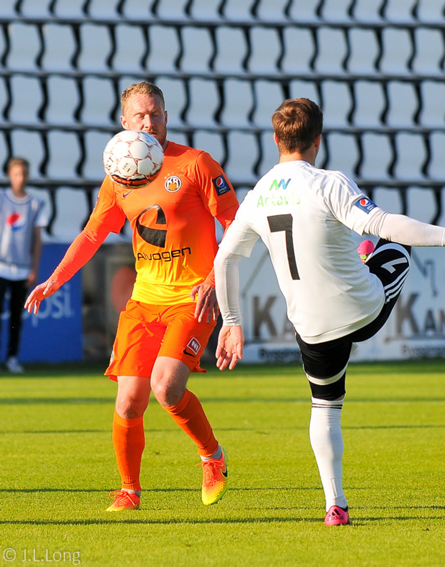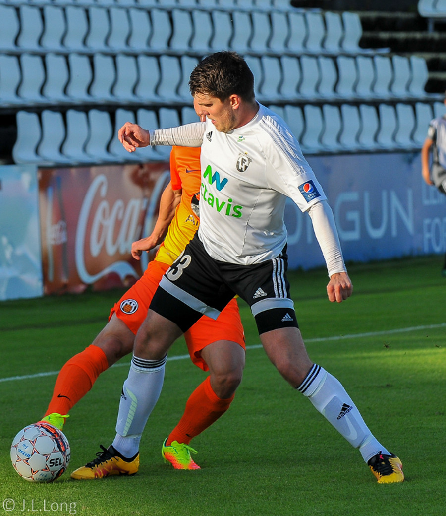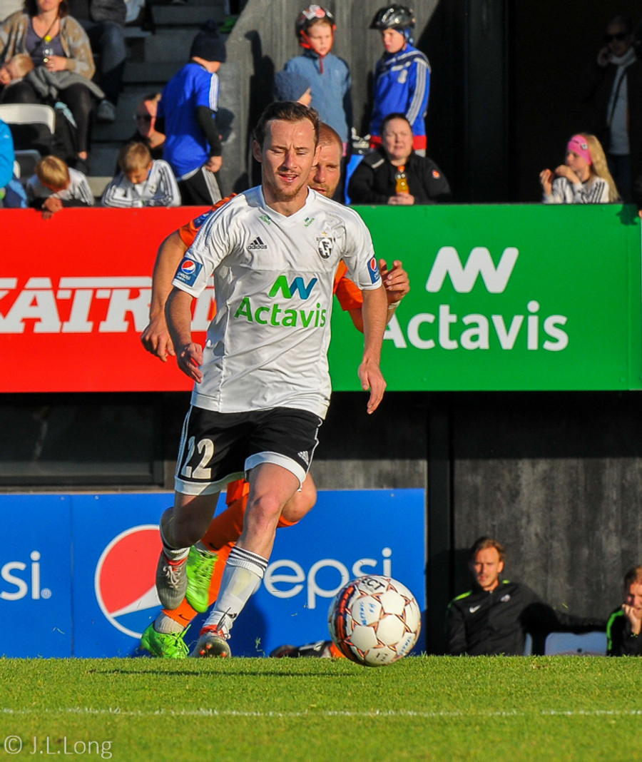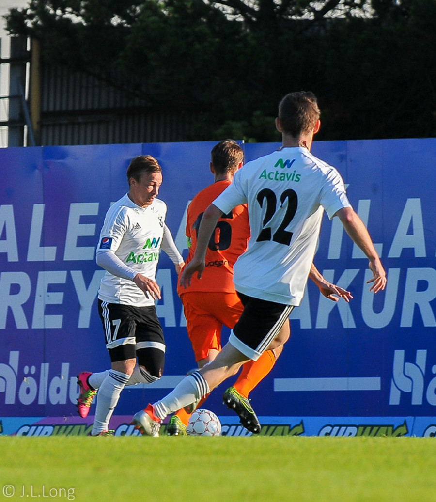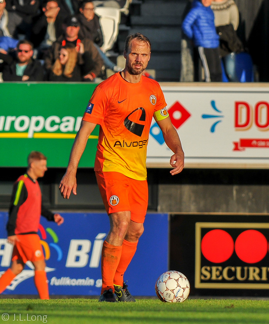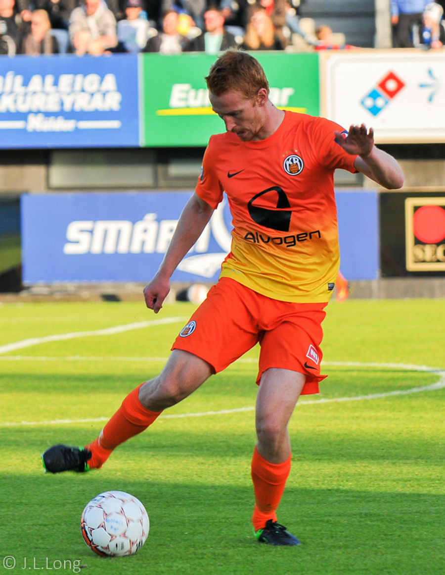 Steven Lennon vinnur boltann af Aroni Bjarka og geysist inn á teiginn vinstra megin. Indriði stöðvar för hans með góðri tæklingu. Hornspyrna.