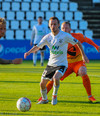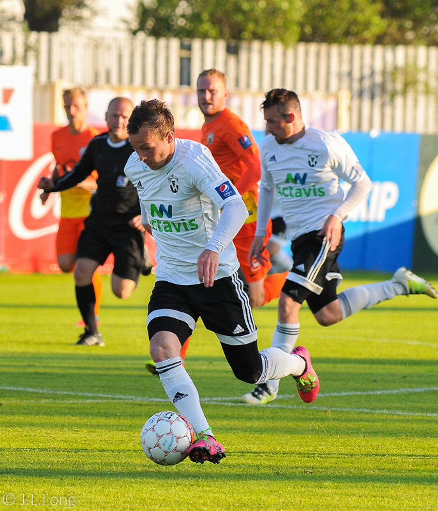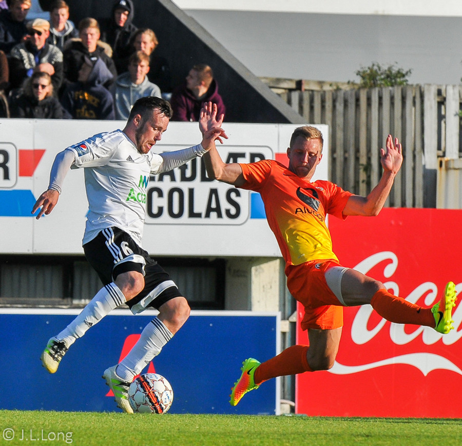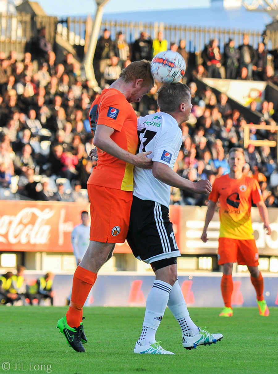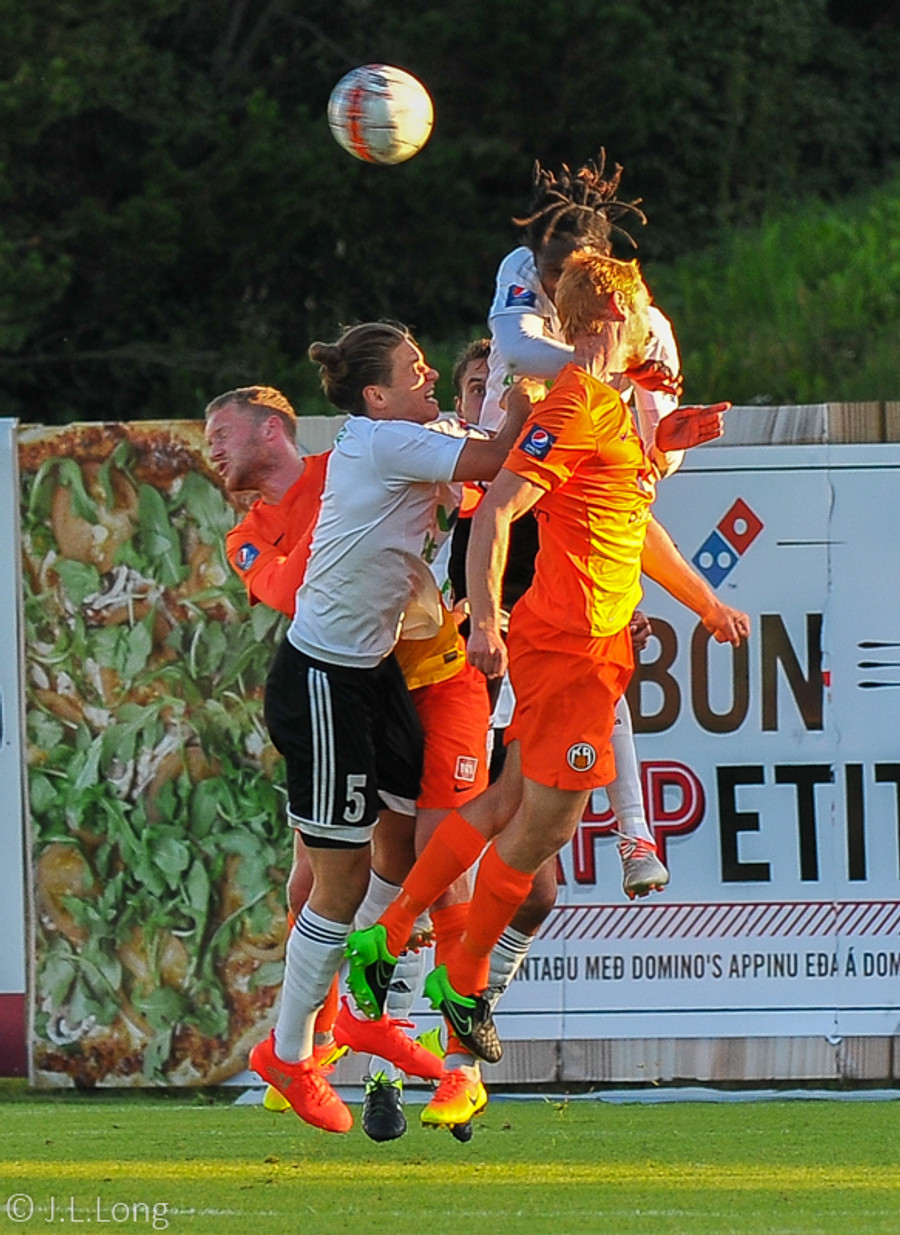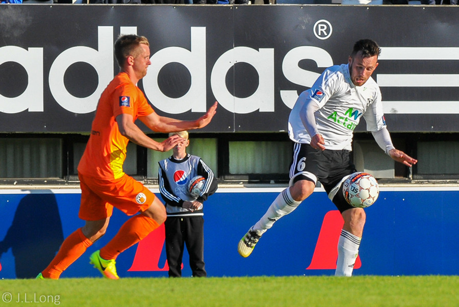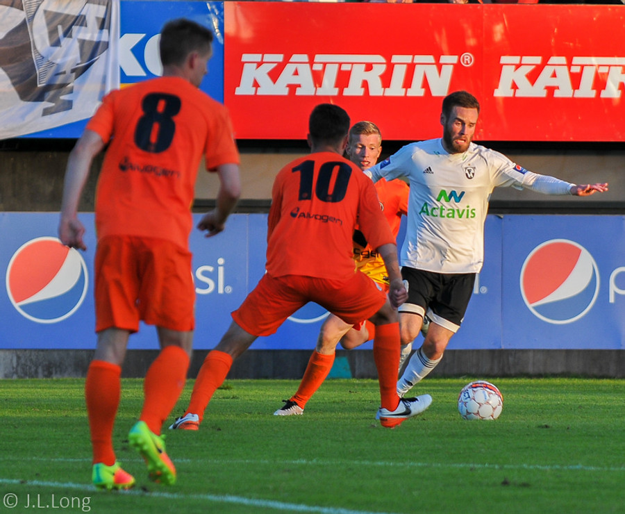 Steven Lennon vinnur boltann af Aroni Bjarka og geysist inn á teiginn vinstra megin. Indriði stöðvar för hans með góðri tæklingu. Hornspyrna.