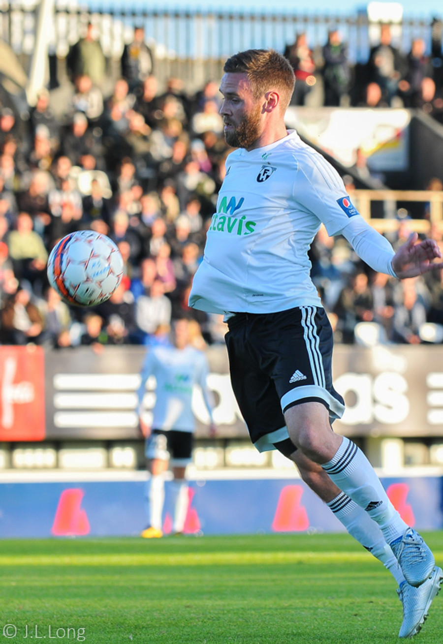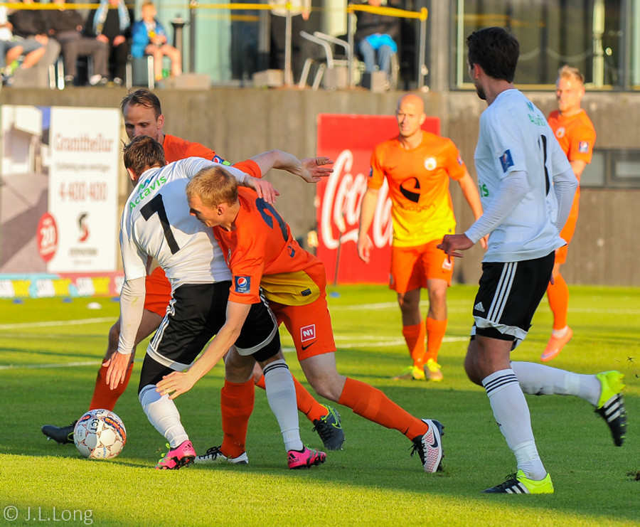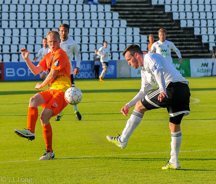 Kennie Chopart á skot fyrir utan teig sem fer í landa hans og samherja, Jeppe Hansen. Dæmigert fyrir leikinn kannski.