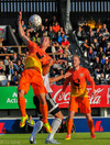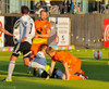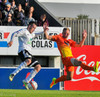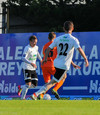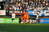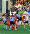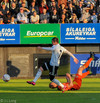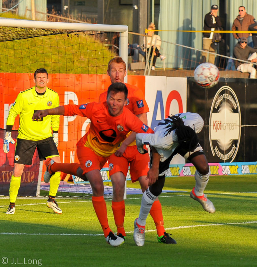 Boltinn fer úr leik og þá fær Kennie gult spjald. Það er líklega fyrir atvik sem gerðist á undan atvikinu í vítateignum en þá lét hann aðstoðardómarann á hinum enda vallarins heyra það eftir baráttu út við hliðarlínu!