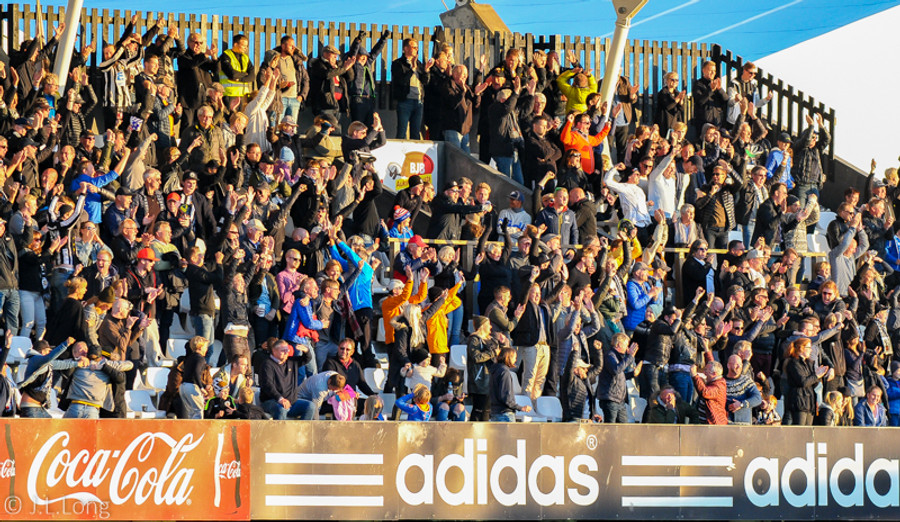 Hér í stúkunni eru ungir stuðningsmenn FH með belgíska fánann til heiðurs Jonathan Hendrickx og Jeremy Serwy.
