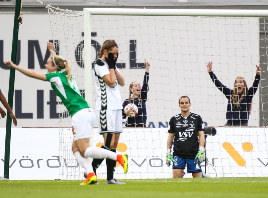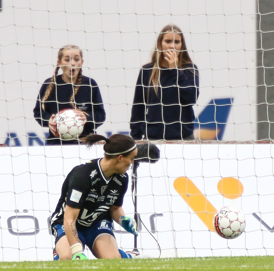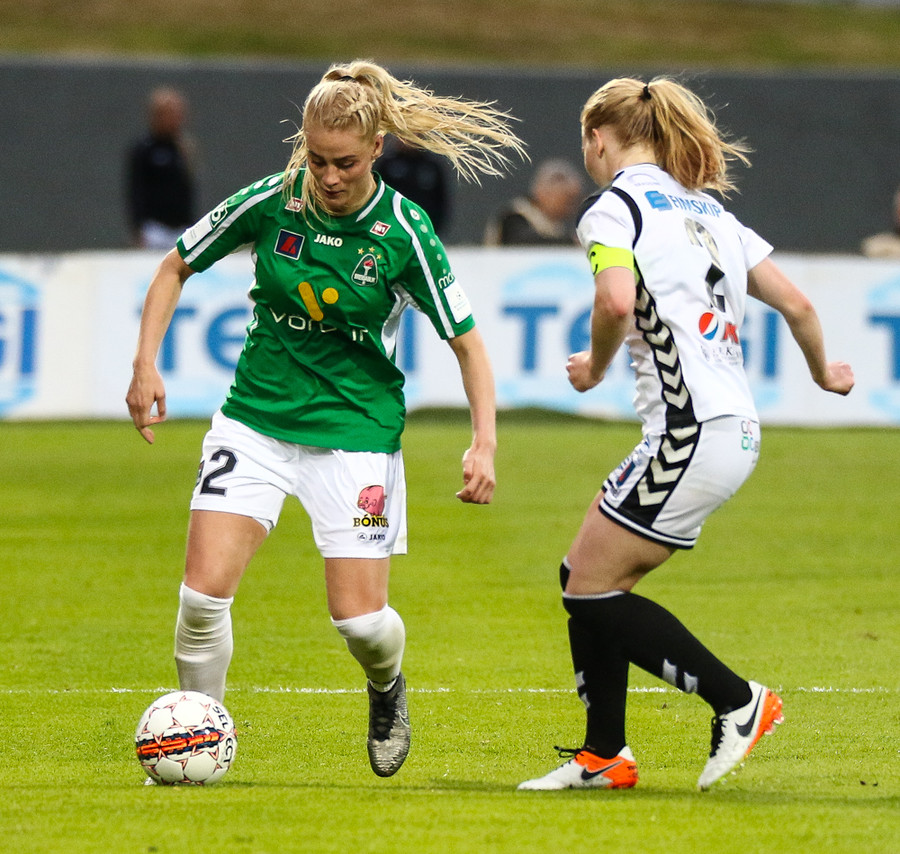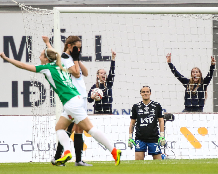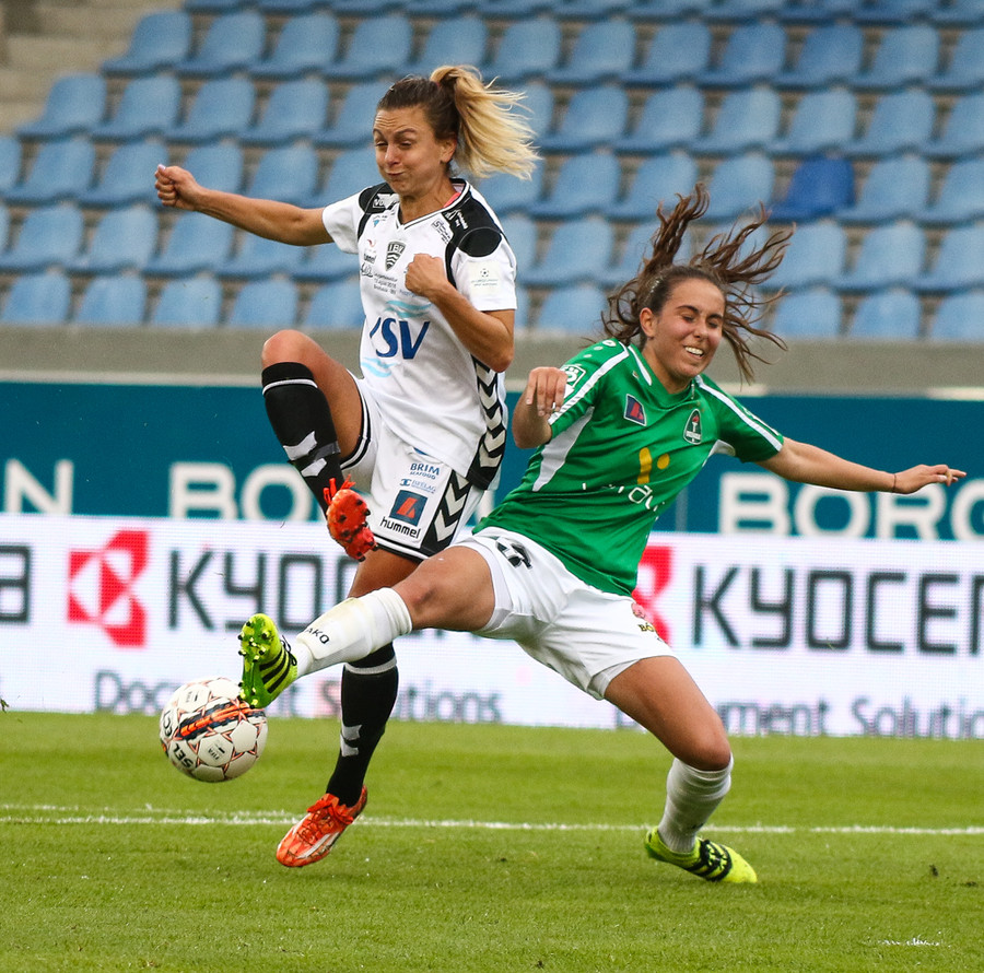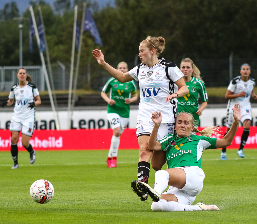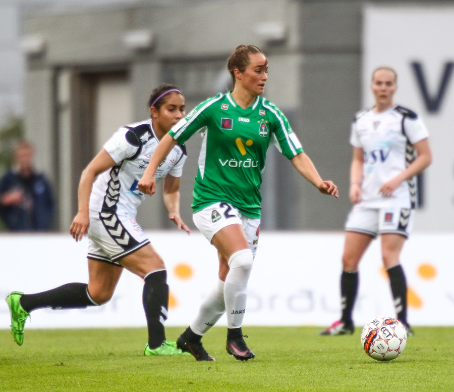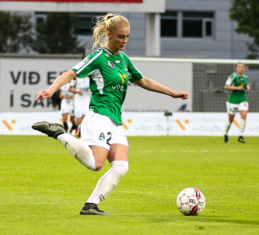 Svava Rós fer upp hægri vænginn og á mjög hættulega fyrirgjöf sem Arianna kemur í horn.