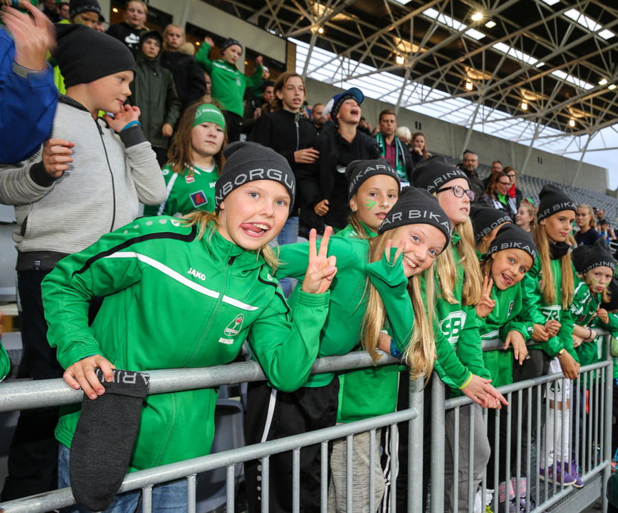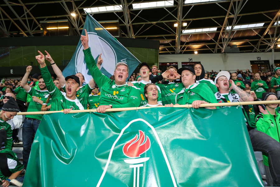 Það heyrist mjög vel í Eyjamönnum í stúkunni. Grunar að margir þeirra ætli að taka sér góða bikarhelgi í bænum og mæta á báða leikina.