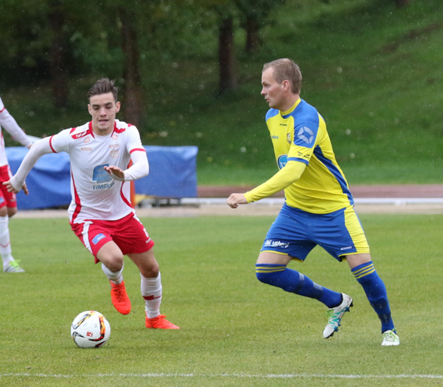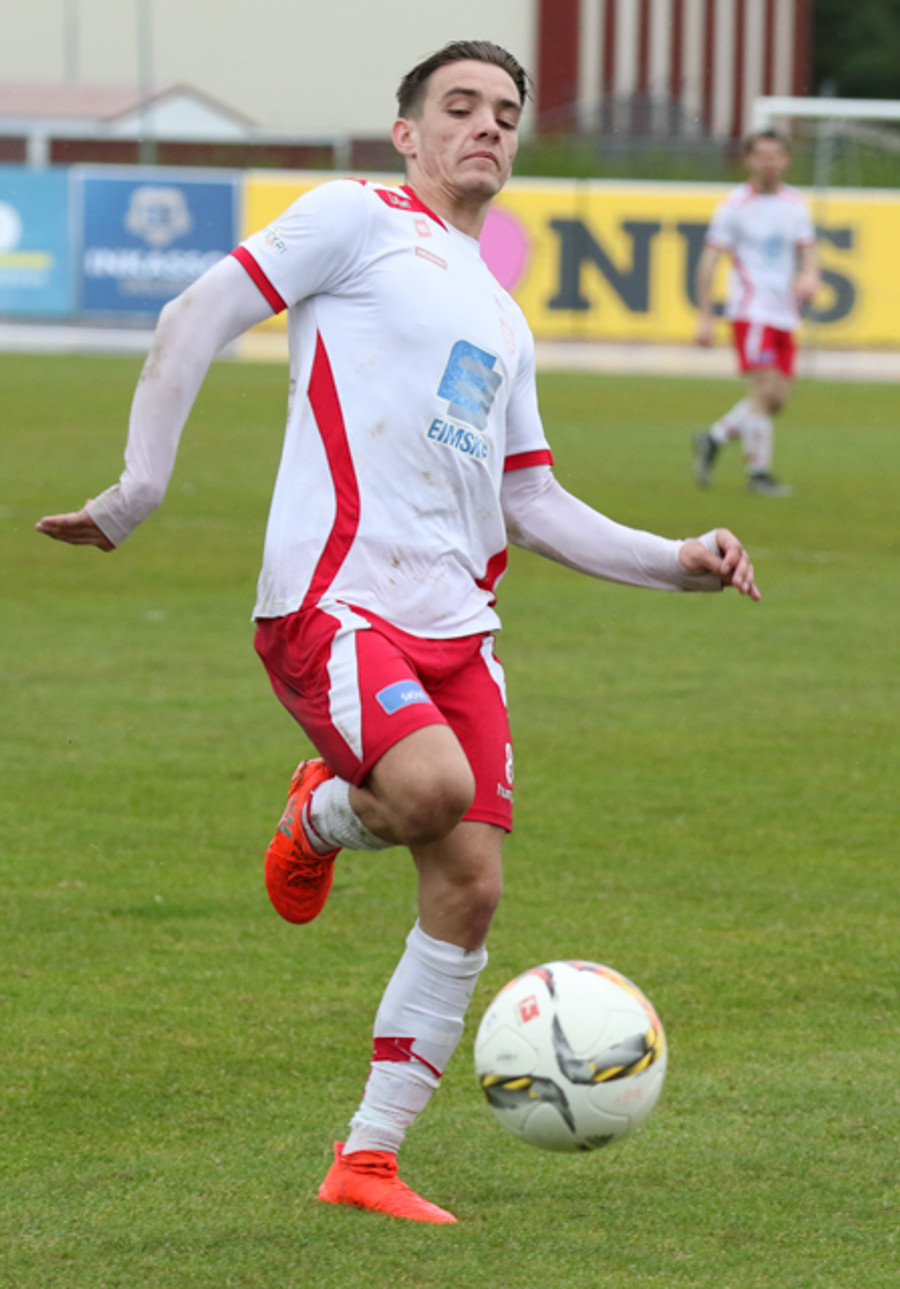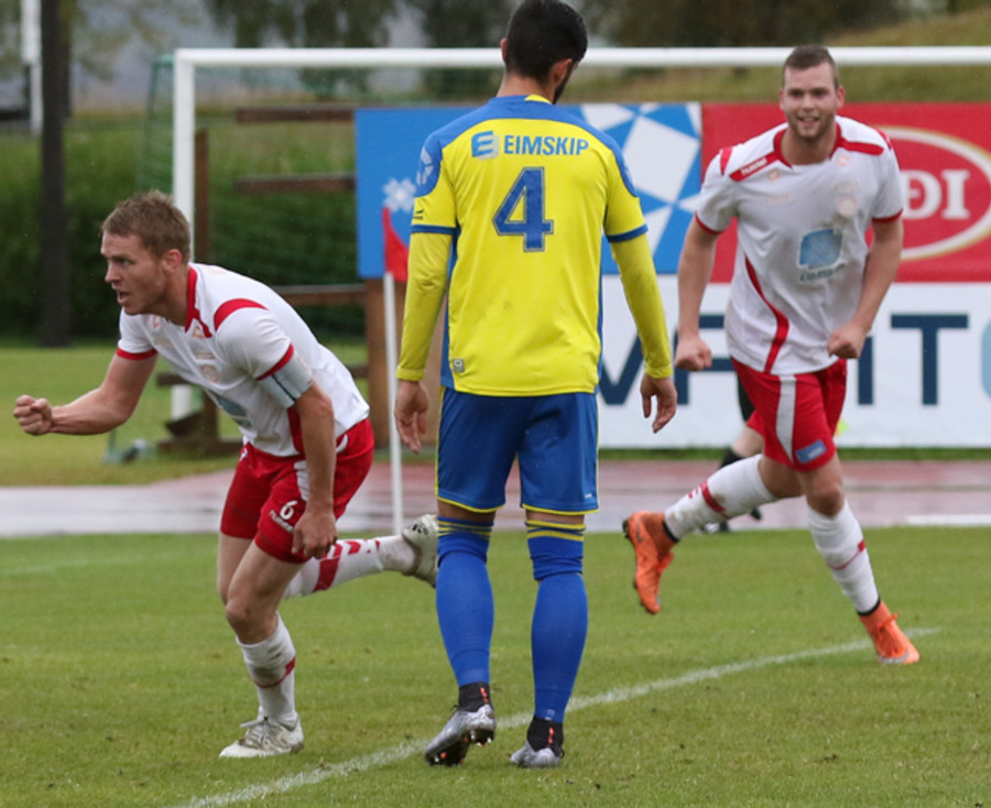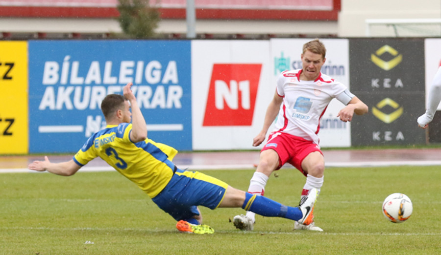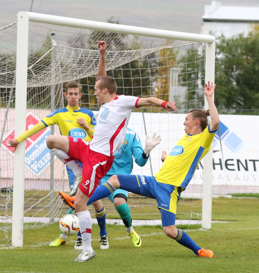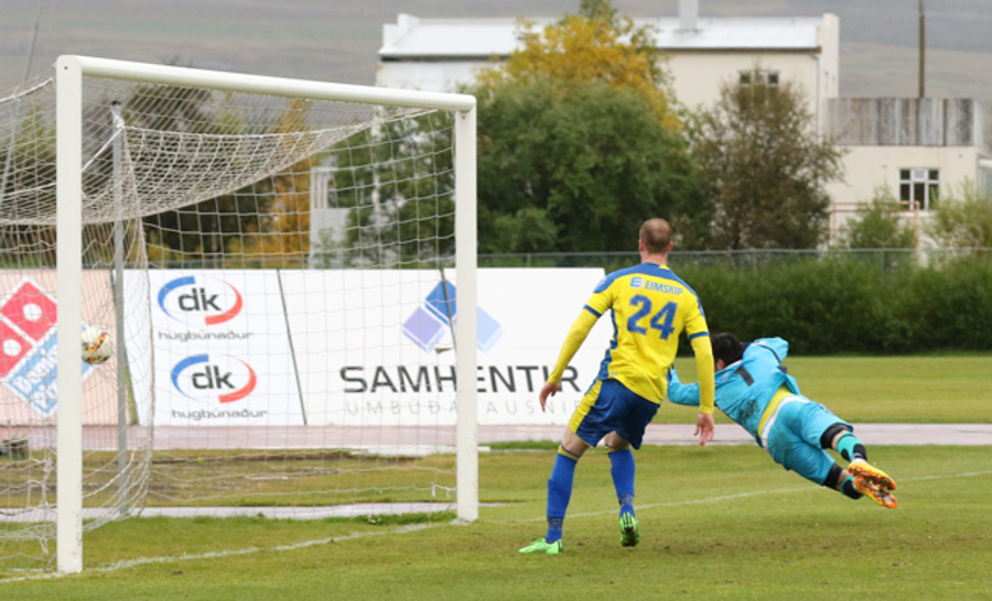 Alexander Veigar með hörkuskot sem Sandor ver vel í markinu. Gestirnir fá hornspyrnu