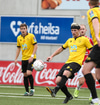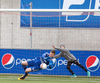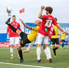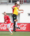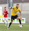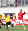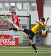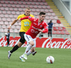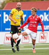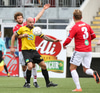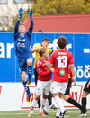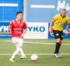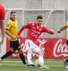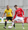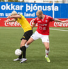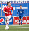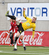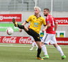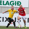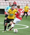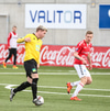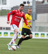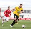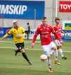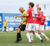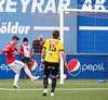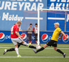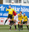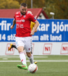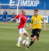 Haukur páll vinnur boltann á miðjunni og lætur svo vaða á markið en Árni Snær ver í horn