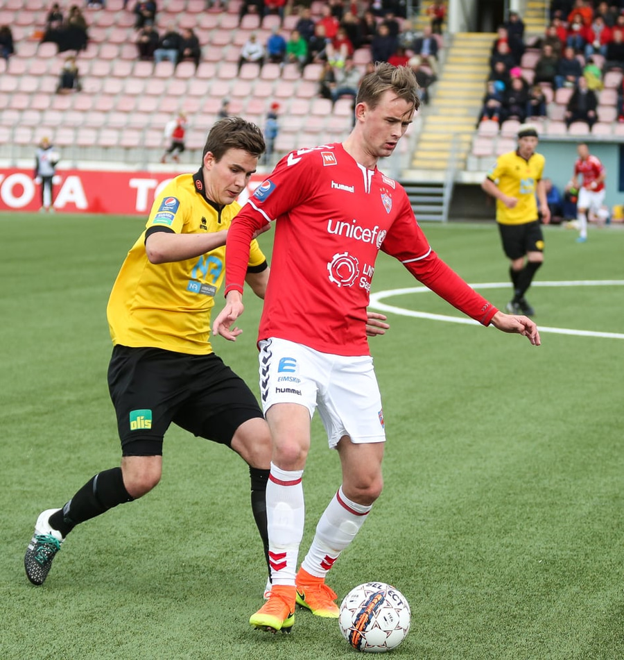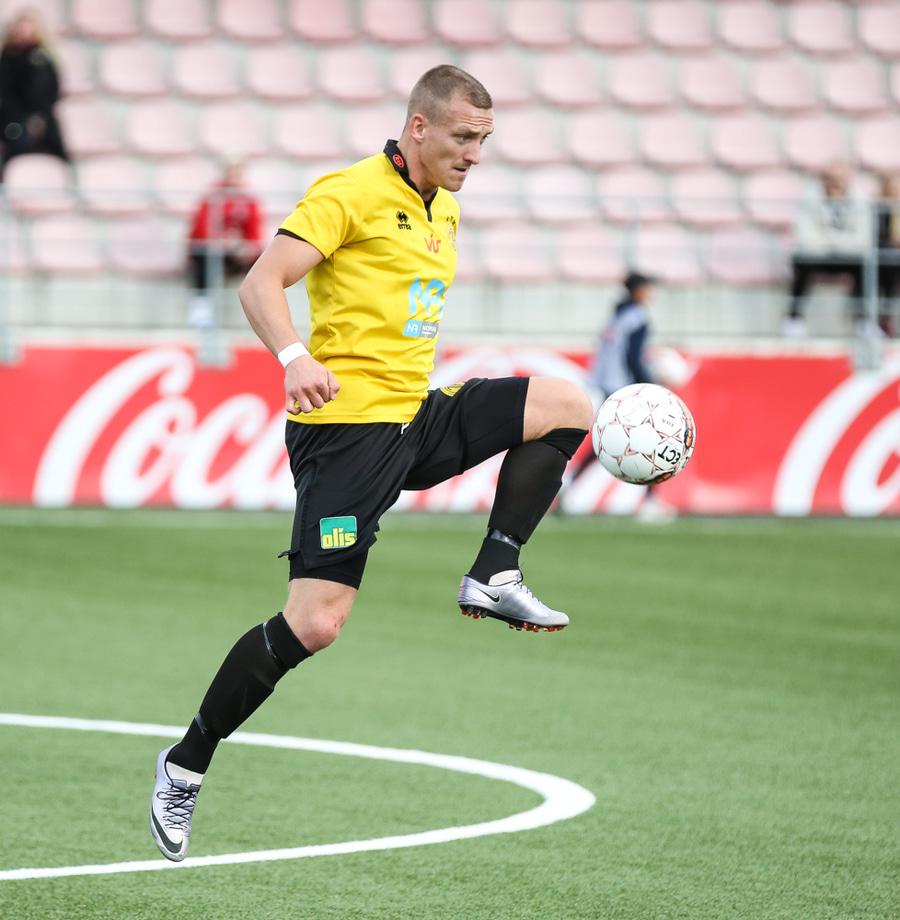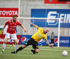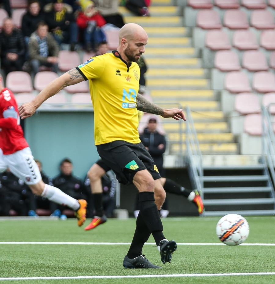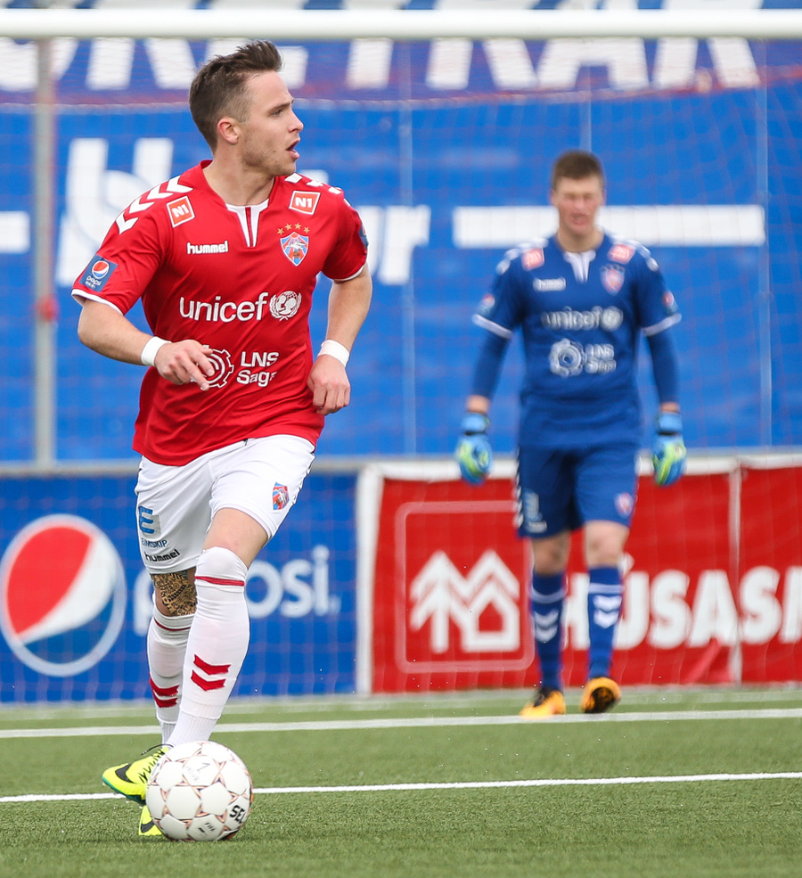 Kristinn Freyr skorar en rangstæða dæmd. Kristinn og Hansen voru sloppnir einir í gegn Hansen óeigingjarn og gefur á Kristinn sem var fyrir innan þegar sendinginn kom.