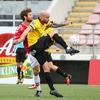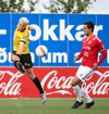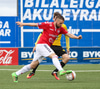 Sigurður Egill í góðu færi reynir að skrúfa boltann uppi nær en Árni ver í horn.