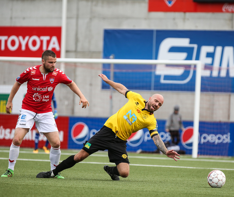 Sigurður og Albech með skemmtilegt samspil upp hægri kanntinn sem endar með ágætis skoti hjá Sigurði en Árni Snær sem fyrr vel á verði í marki skagamanna.
