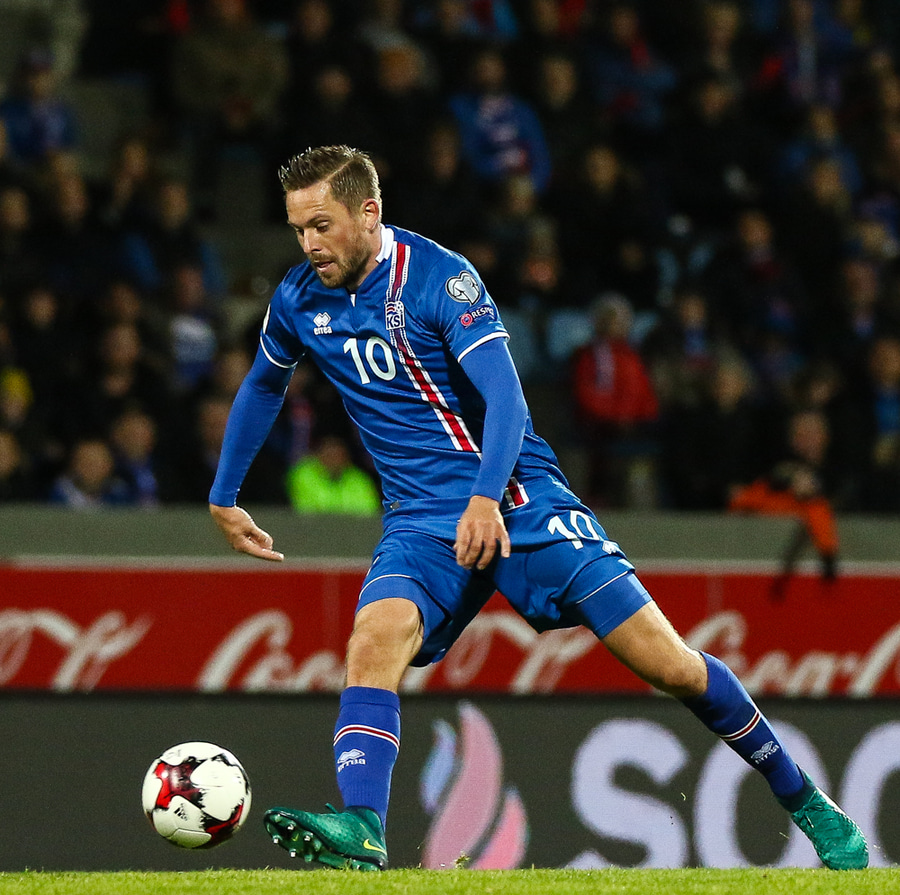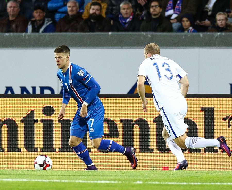 Aron Einar vinnur aukaspyrnu rúmum 25 metrum frá markinu. Gylfi reynir aftur.