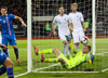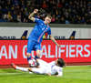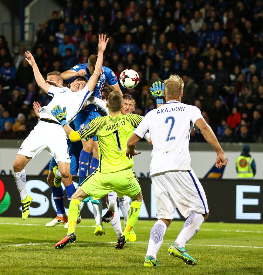 ÍSLAND ER BÚIÐ AÐ JAFNA. Birkir Bjarnason vann hornspyrnu sem Jóhann Berg tók, beint á kollinn á Kára sem skallaði í markið úr þröngu færi. Hradecky fór út í boltann og missti af honum og var markið opið.