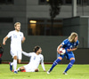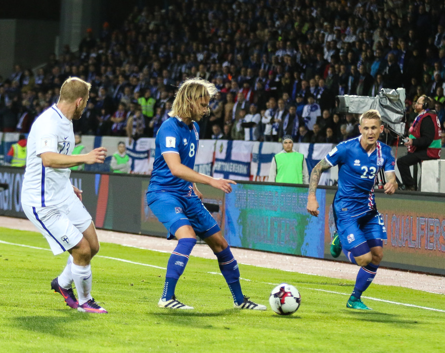 Finnar byrja með boltann og sækja í áttina að Laugardalslaug.