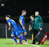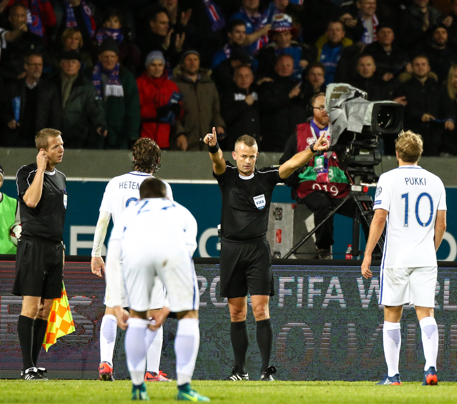 Kári Árnason kemur með hressilega tæklingu á Hamalainen. Honum fannst hann ná boltanum en tæklingin var hörð. Dómarinn gefur honum tiltal og síðasta séns áður en hann fær spjald.