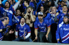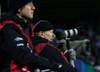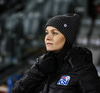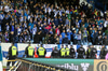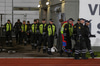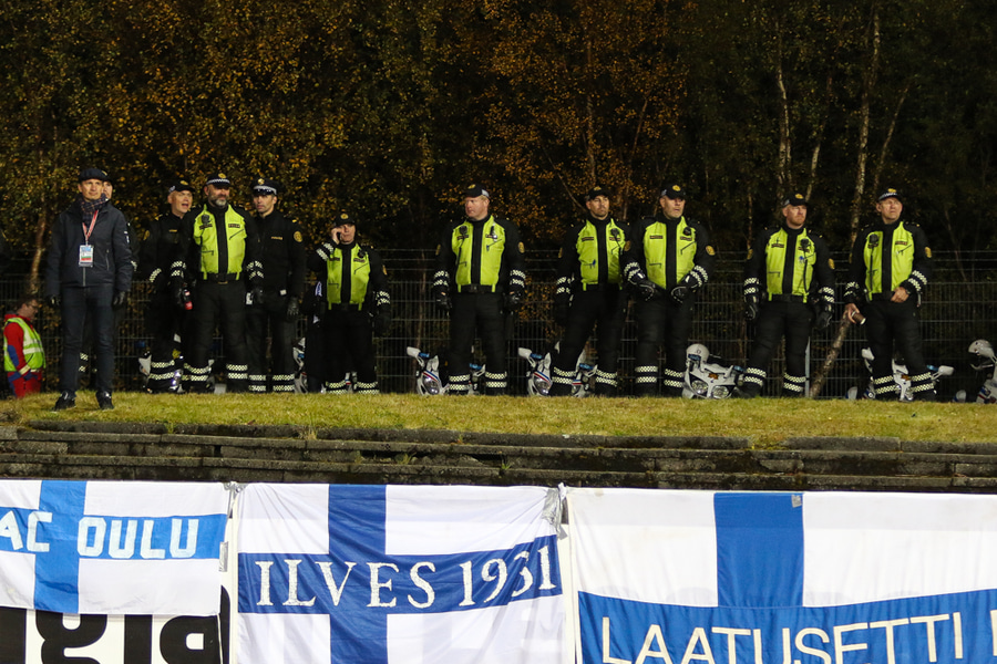 Leikmenn hita nú upp og er fólk hægt og rólega að týnast í stúkuna. Finnar eru búnir að þónokkrum fánum fyrir, sín megin í stúkunni.
