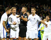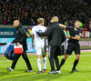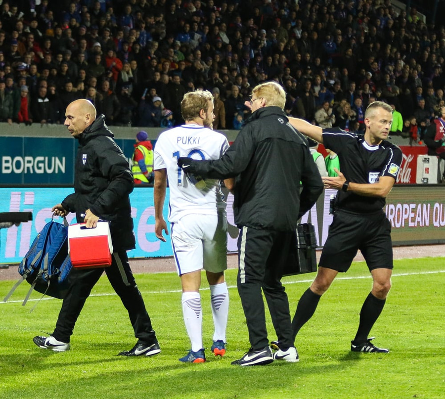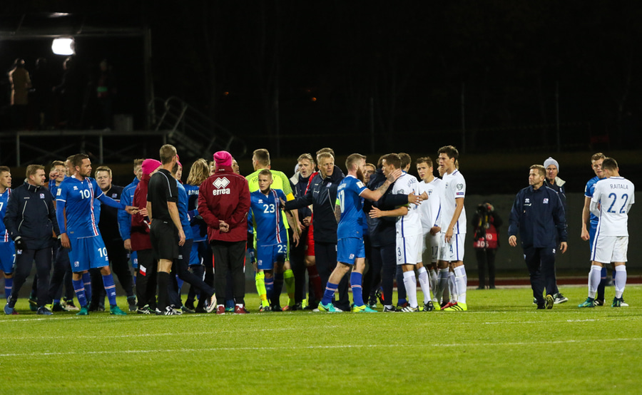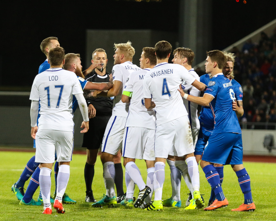 Teemu Pukki brýtur af Aroni en fær síðan hendina á fyrirliðanum í andlitið. Pukki ekki sáttur við þetta en Ísland fær aukaspyrnu á eigin vallarhelming.