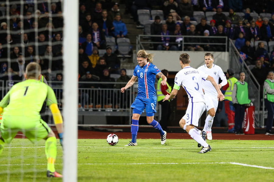 Aron Einar reynir skot af um 30 metrum en það er vel framhjá. Það verður mikið þolinmæðisverk að komast í gegnum fjölmenna vörn Finna.