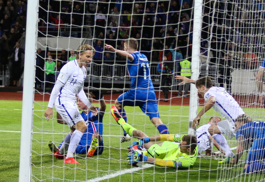 Alfreð Finnbogason skorar eftir skot frá Gylfa en hann var kolrangstæður og það sá norski aðstoðardómarinn, því miður.