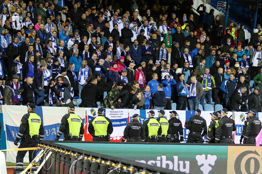 Víkingaklappið er komið í gang á Laugardalsvelli eða Viikingi Huuh eins og finnski kollegi minn segir. Honum finnst þetta æðislegt.
