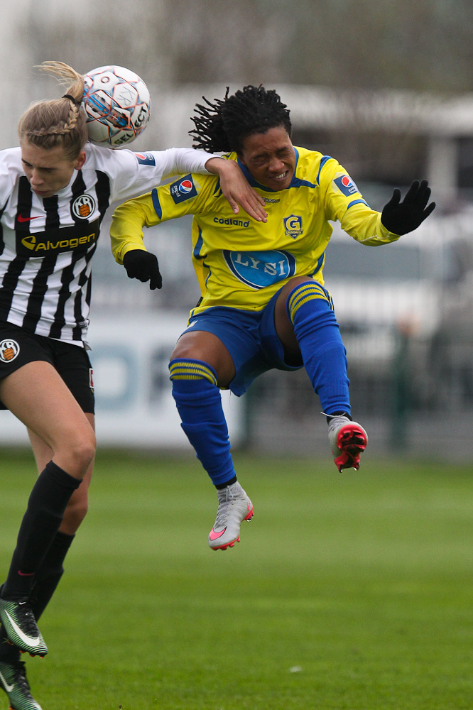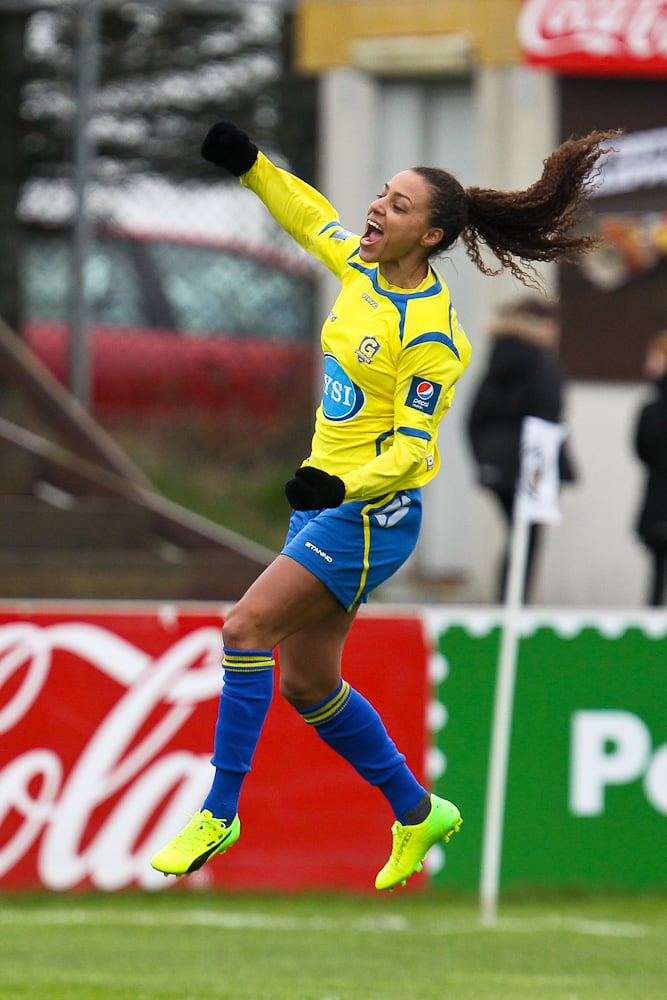 Sara Lissy brýtur á Carolina nokkrum metrum fyrir utan teiginn. Nú stilla Thaisa og Carolina sér upp fyrir framan boltann, Carolina hleypur yfir boltann og Thaisa tekur spyrnuna en spyrnan er fram hjá.