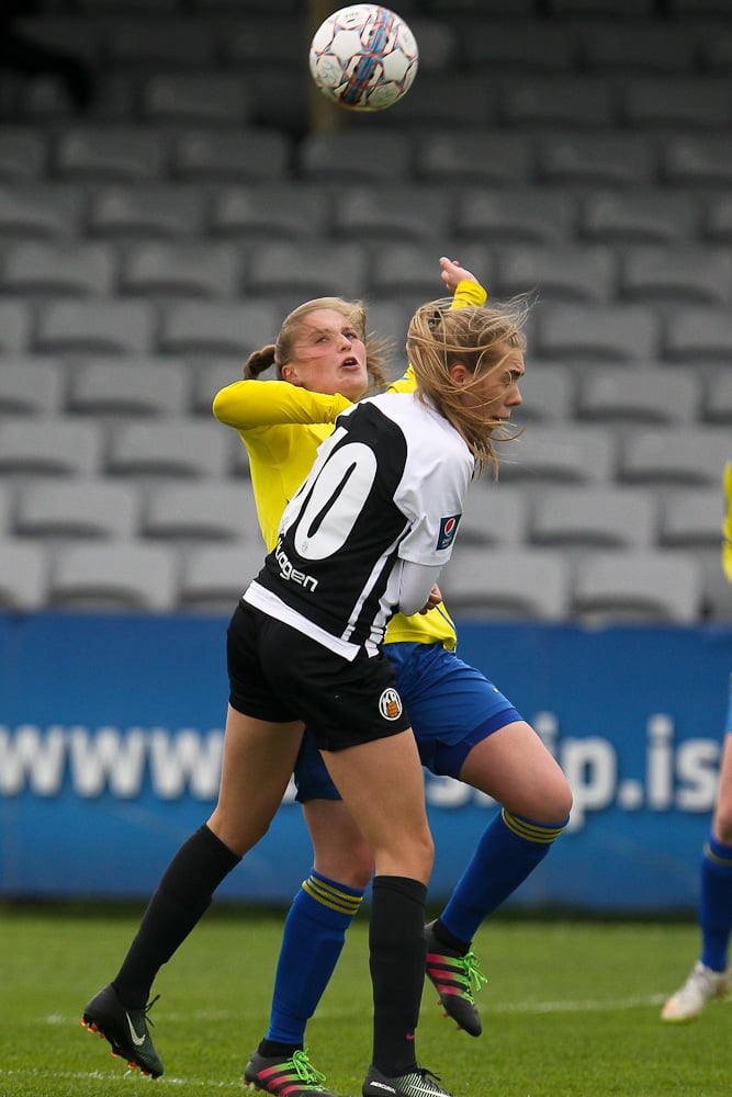 Klaufaleg sending hérna hjá Dröfn sem ætlar að gefa hann til baka á Guðrúnu Bentínu en Emma bjargar henni og kemur boltanum frá. Þarna var Ásdís nálægt því að ná til boltans.