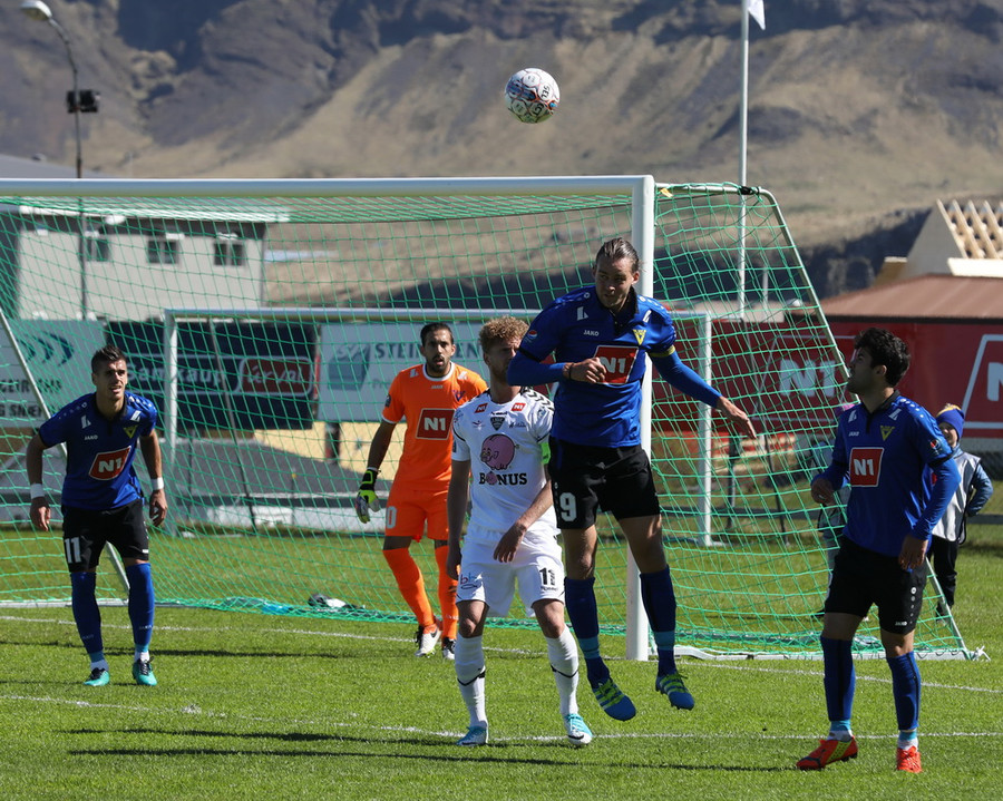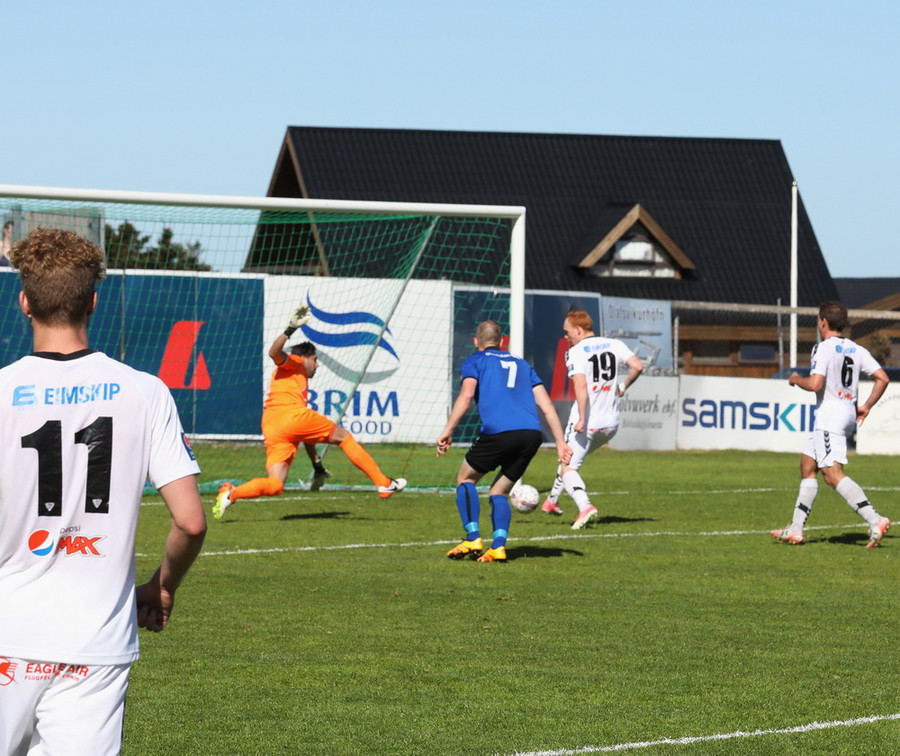 Kenan með gullfallegan bolta á fjær beint á kollinn á Guðmundi Stein sem ætlaði að setja boltann í fjær. Góður skalli en mögnuð varsla er Halldór blakaði boltanum framhjá stönginni