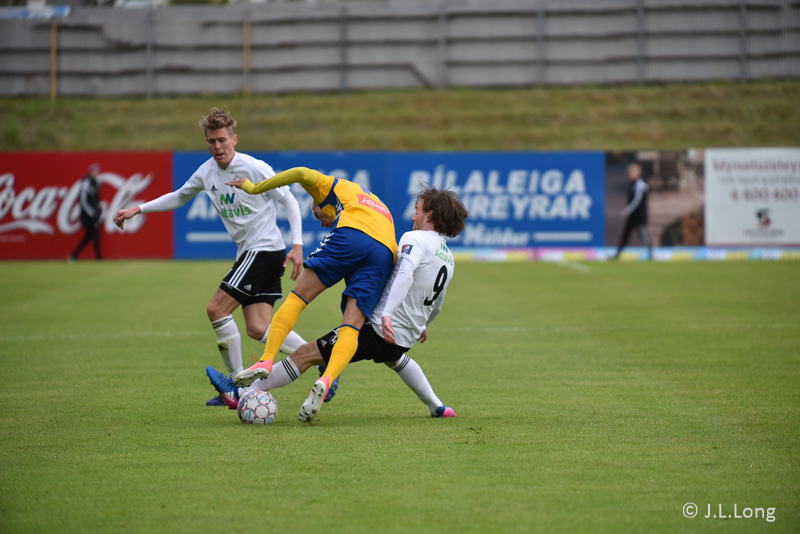 Bergsveinn of seinn í tæklingu og Igor Taskovic liggur eftir.