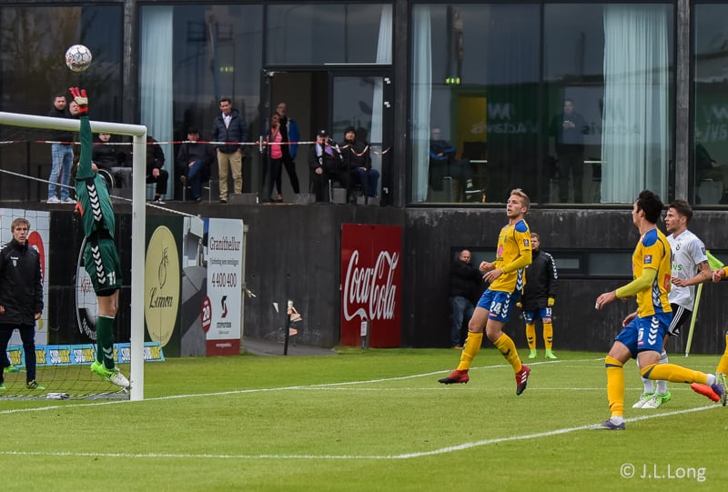 Gunnar Nielsen fer fram í horni til að reyna að kreista fram jöfnunarmark. Þung sókn í gangi! Boltinn endar í höndum Þórðar Ingasonar.