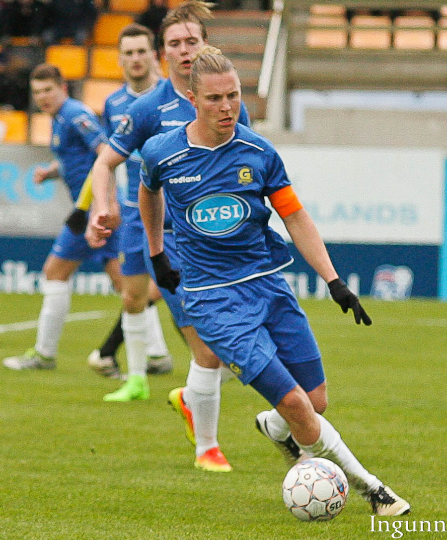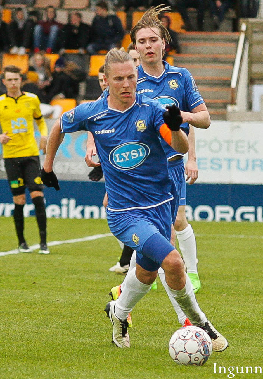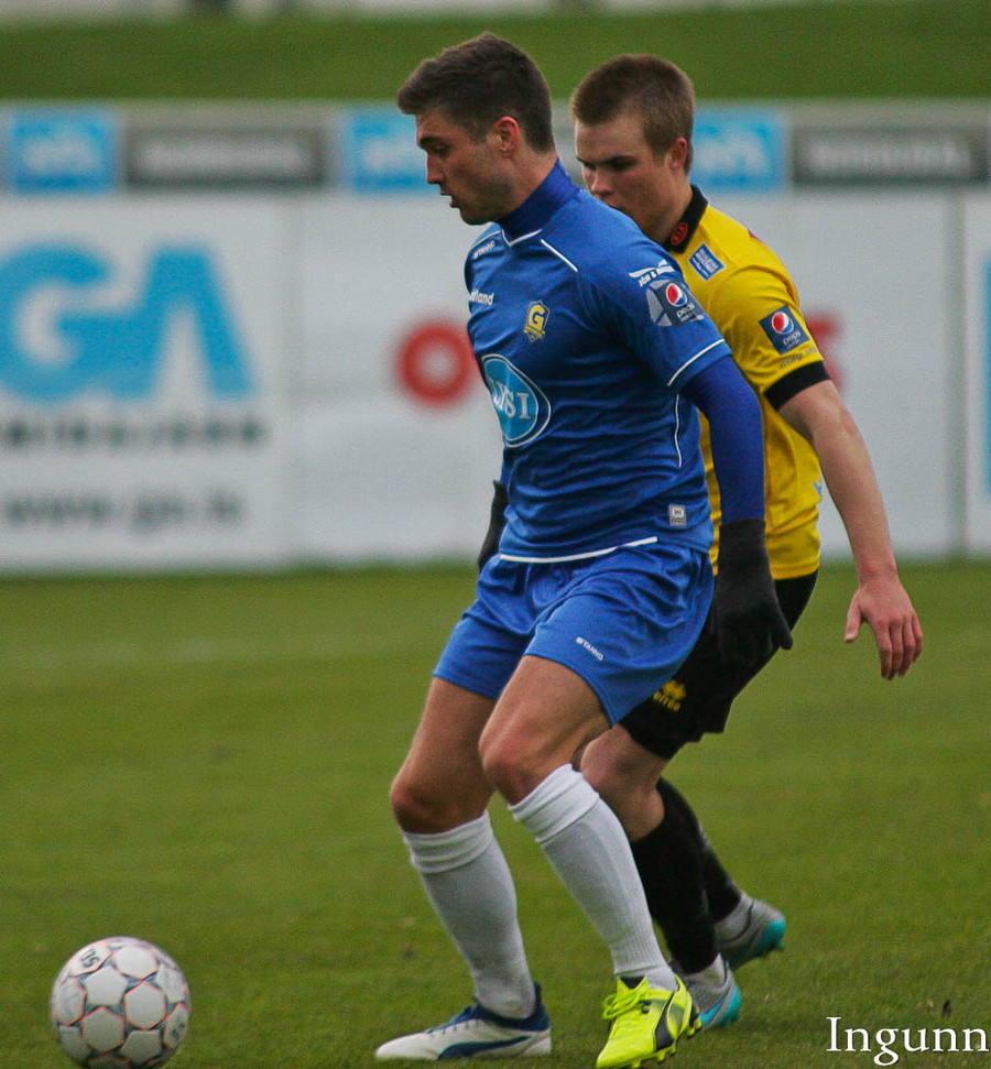 Garðar í hörkufæri! Fær boltann í teignum eftir fyrirgjöf frá Hilmari. Snýr af sér varnarmenn en skotið slakt og í Grindvíking. Þarna átti Garðar að gera betur.