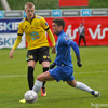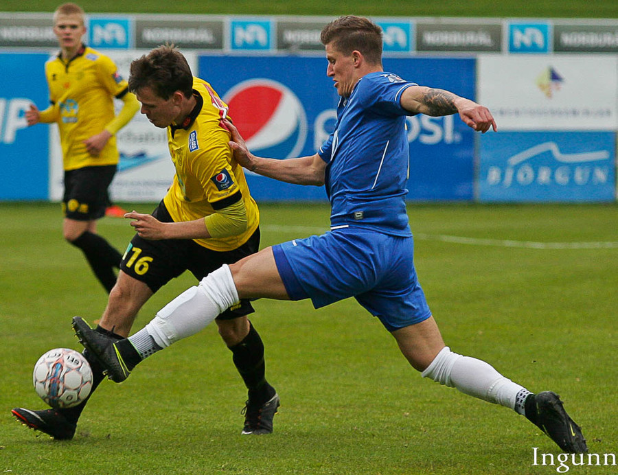 Garðar í hörkufæri! Frábær sending inn fyrir frá, jú Þórði Þ og Garðar tekur boltann vel niður en í varnarmann og aftur fyrir. Stórhætta úr horninu þar sem boltinn dettur niður í teignum en varnarmaður gestanna bregst fyrstur við og hreinsar.