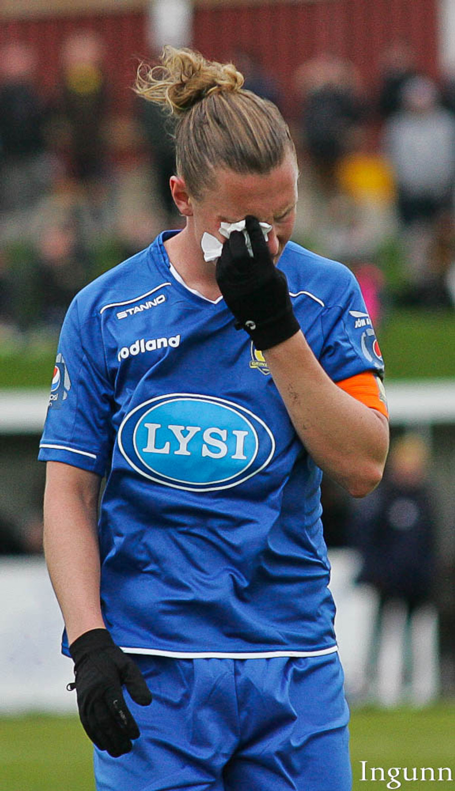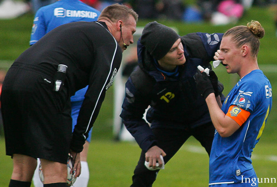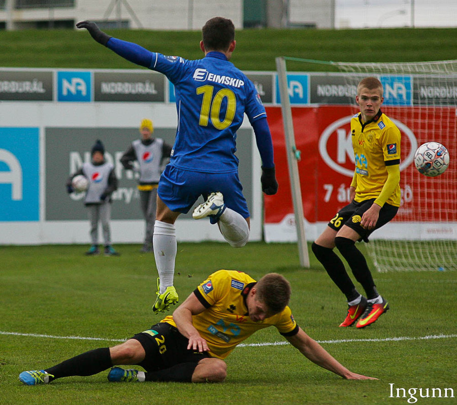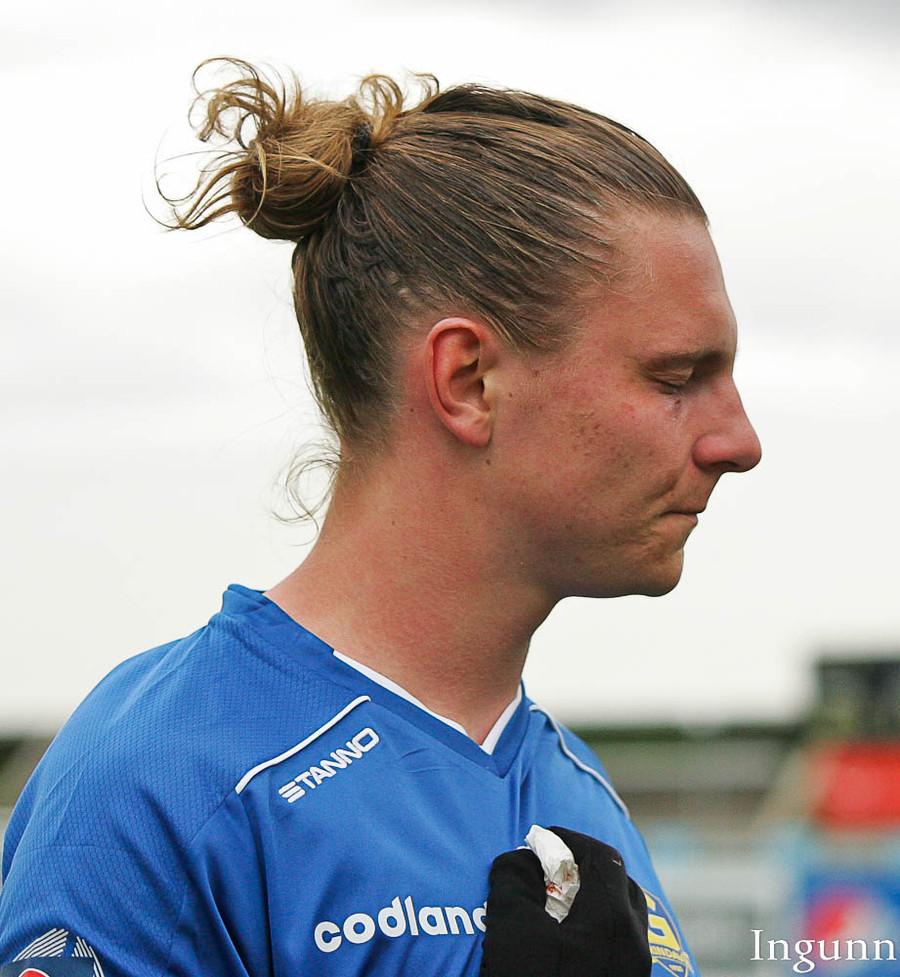 Þarna slapp Jajalo með skrekkinn. Þórður Þ með hornspyrnu og Jajalo misreiknar boltann og missir hann yfir sig en skallinn frá Alberti Hafsteins er yfir markið.