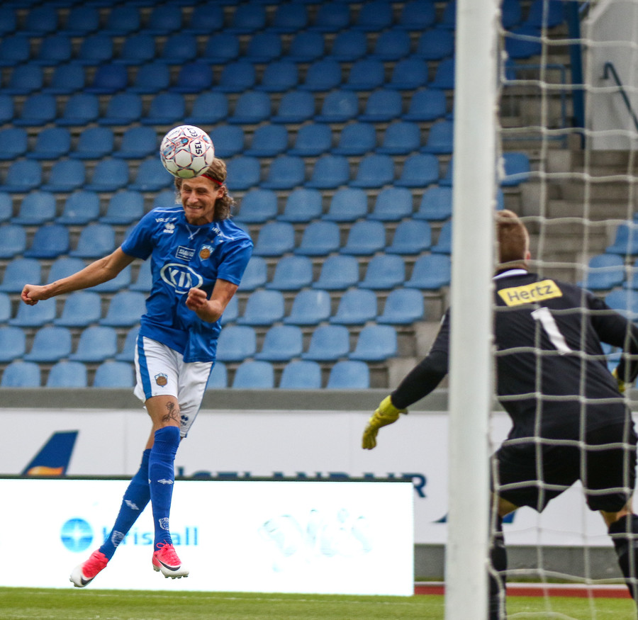 Simon Smidt á hornspyrnu frá vinstri á fjærstöngina þar sem Guðmundur Magnússon rís hæst en skalli hans beint á Steinar í markinu.
