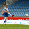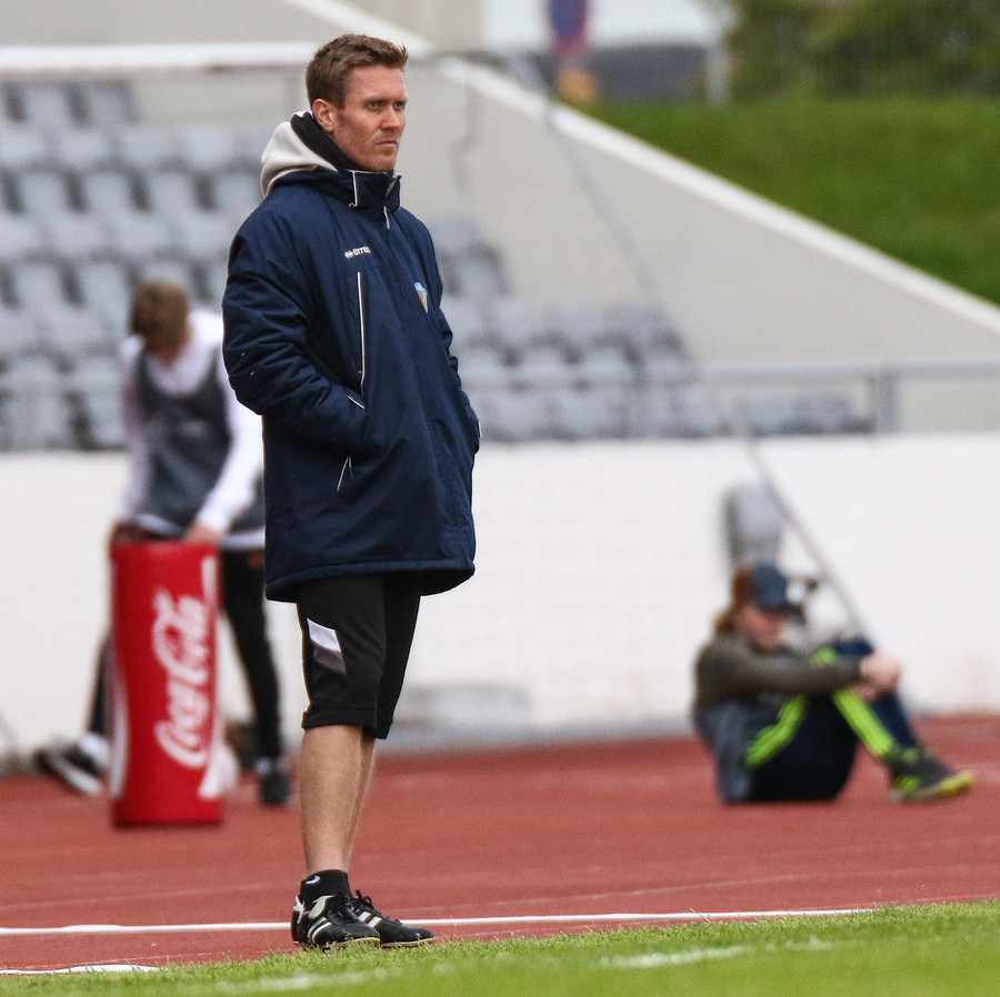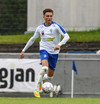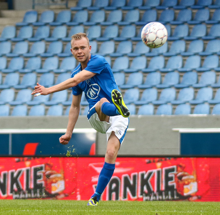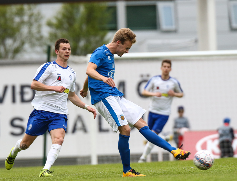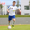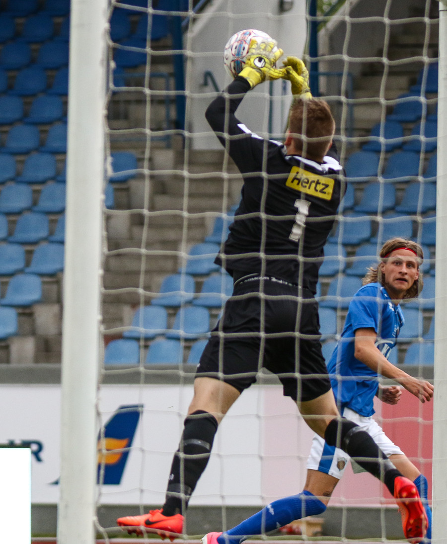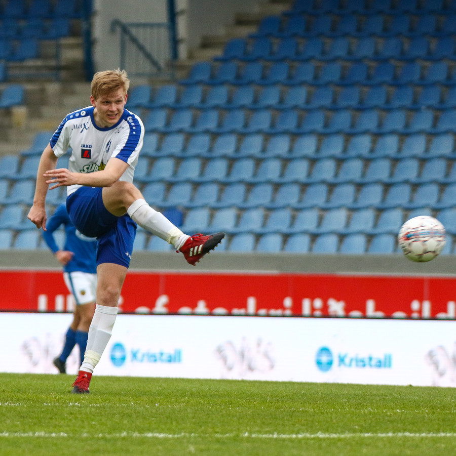 Simon Smidt tekur aukaspyrny af um 25 metra færi og hann lætur vaða, fast meðfram jörðinni en beint á Steinar Örn í markinu sem grípur vel.