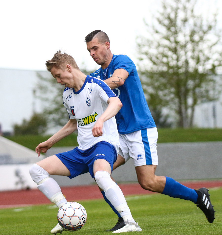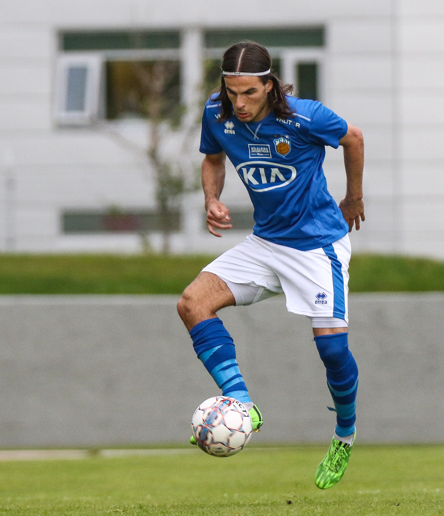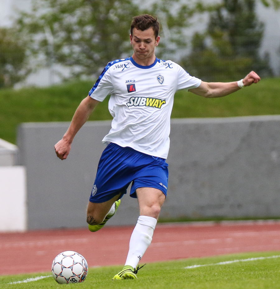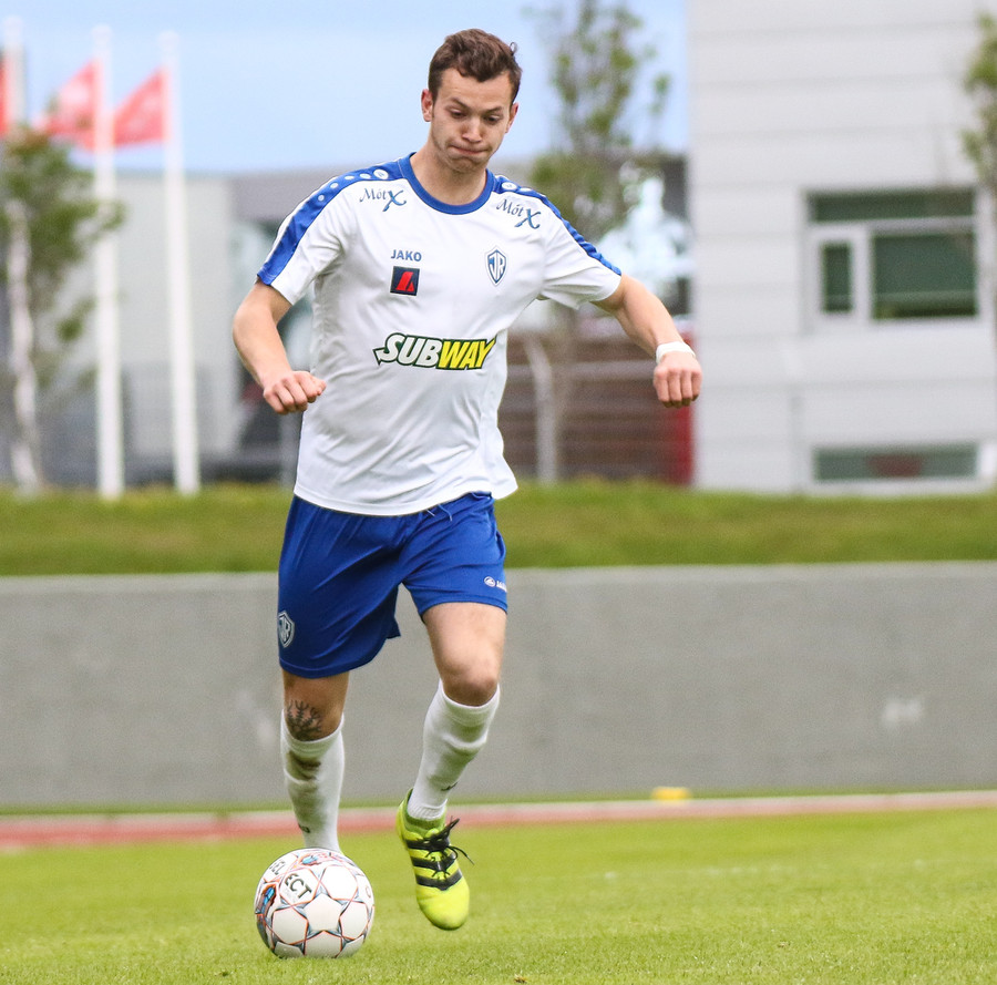 Jóhann Arnar Sigurþórsson fær boltann út á vinstri kantinu áður en hann sker inn og reynir skot af löngu færi en það hátt yfir.