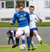 Simon Smidt snýr huggulegan boltan inn fyrir vörn ÍRinga og Indriði Áki er skónúmeri frá því að stýra honum framhjá Steinari í markinu.