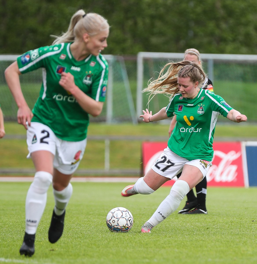 Þetta byrjar af miklum krafti. Svava búin að eiga tvær ágætar fyrirgjafir frá hægri en Lillý hefur verið vel staðsett í teignum.