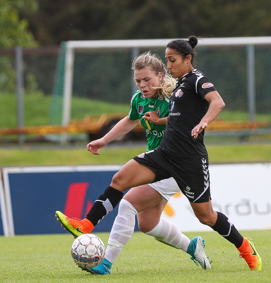 Zaneta missir boltann klaufalega til Andreu Ránar sem lætur vaða utarlega í teignum en Bryndís Lára nær að slá boltann yfir.