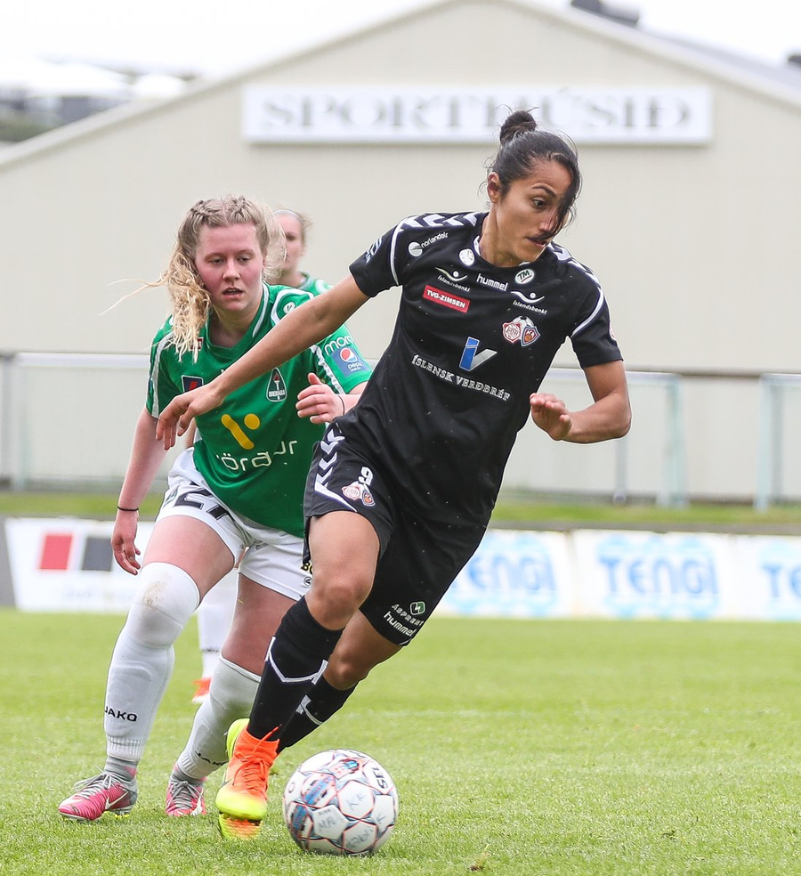 Val gert hjá Berglindi Björg. Snýr laglega á Biöncu á teignum og reynir að búa sér til færi. Bryndís Lára kemur út á móti og bjargar í horn.