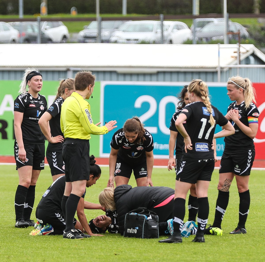 Úff. Natalia liggur sárþjáð eftir tæklingu Rakelar.