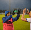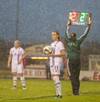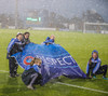 Vallarþulurinn tilkynnir okkur að það séu 862 áhorfendur á vellinum. Töluvert minna en búist var við. Rigningin mögulegur áhrifavaldur.
