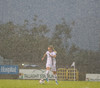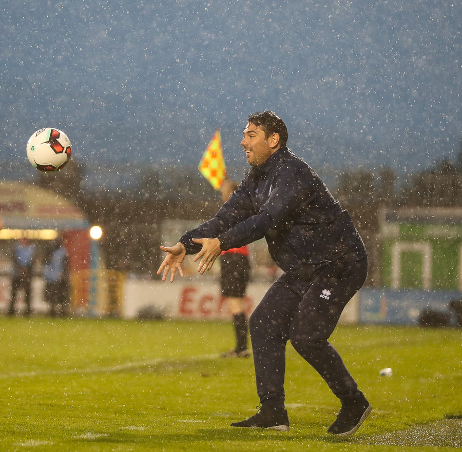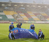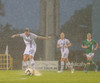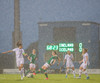 Völlurinn er orðinn afar erfiður viðureignar. Boltinn rúllar hægt en bæði lið reyna að spila með jörðinni um þessar mundir. Það svoleiðis hellirignir!