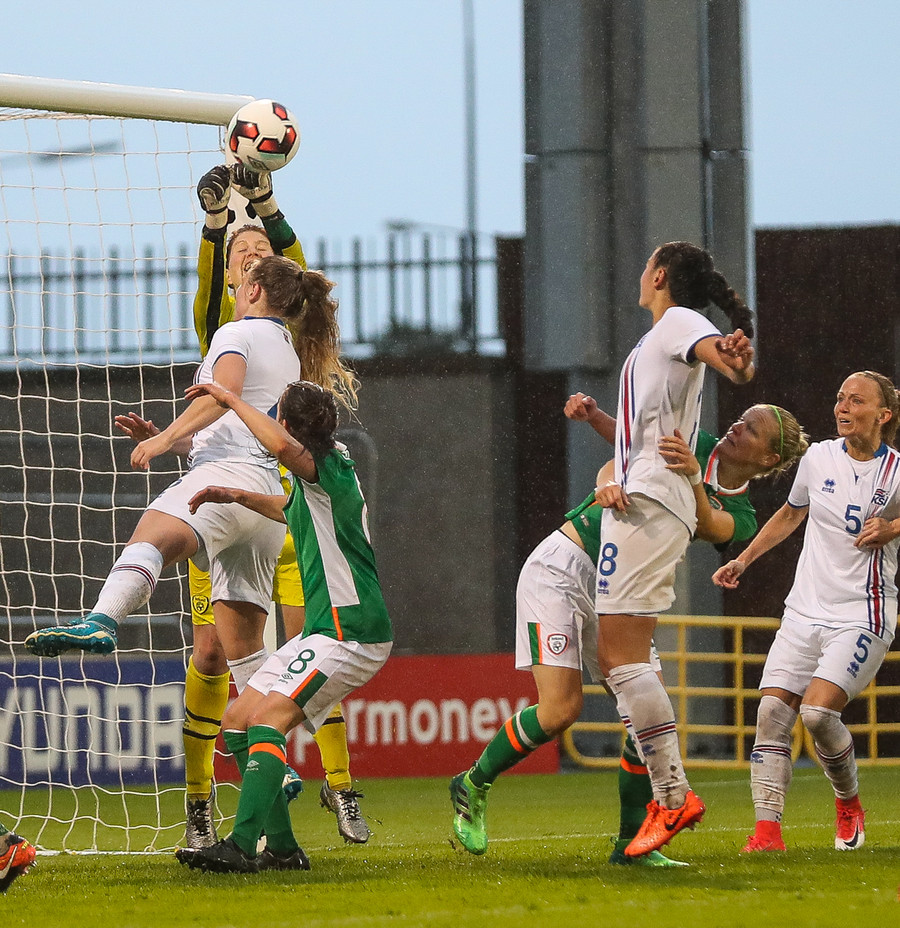 Írar fá því annað horn og í þetta skiptið vinnur Campbell skallann en boltinn er beint á Guðbjörgu.