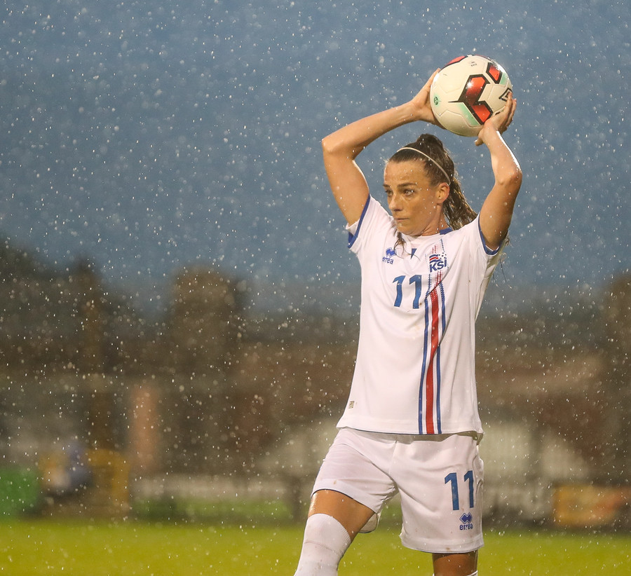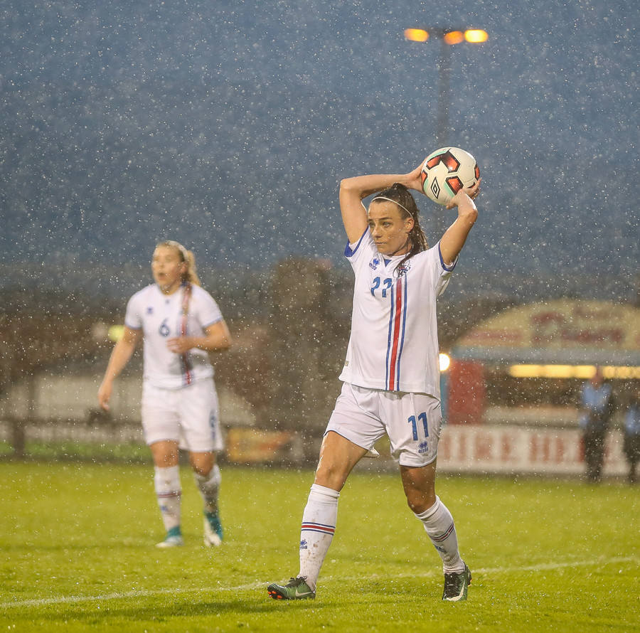Campbell tekur gríðarlangt innkast inn á íslenska teiginn. Okkar konur koma boltanum frá en þetta hefði getað orðið hættulegt. Minnti á Sif okkar þarna.