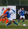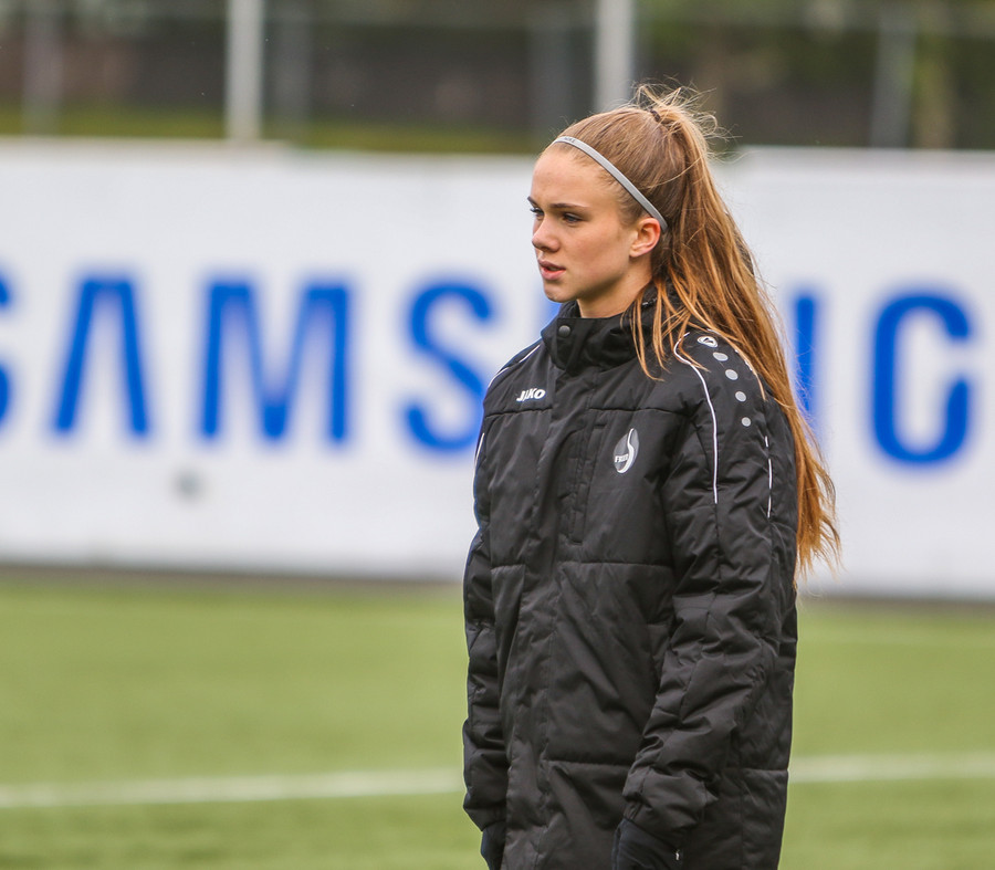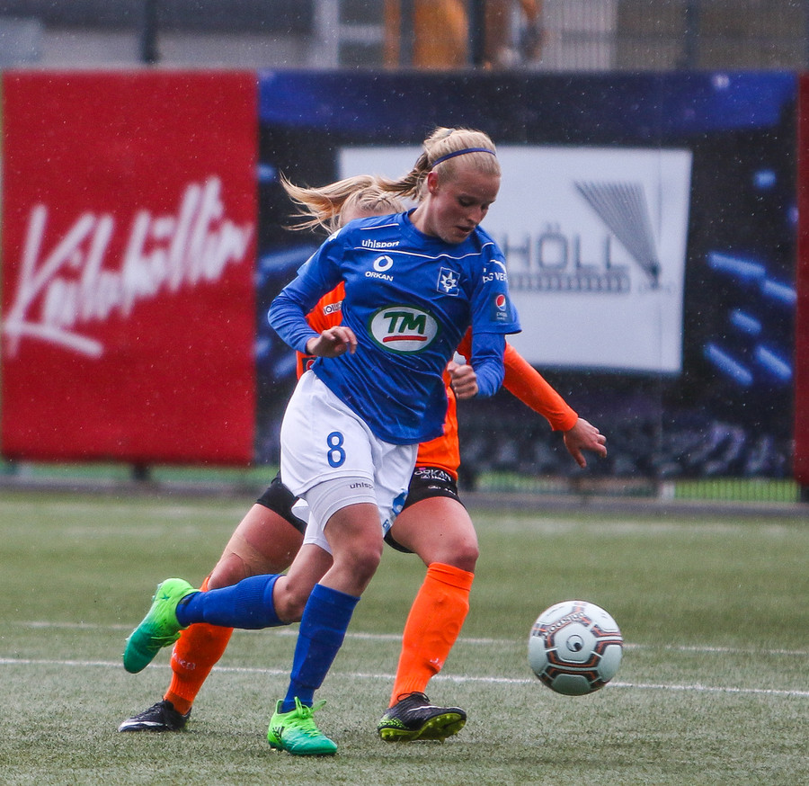 Harpa kemst inn fyrir en fyrirgjöf hennar fer í varnarmann og aftur fyrir.