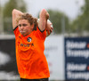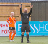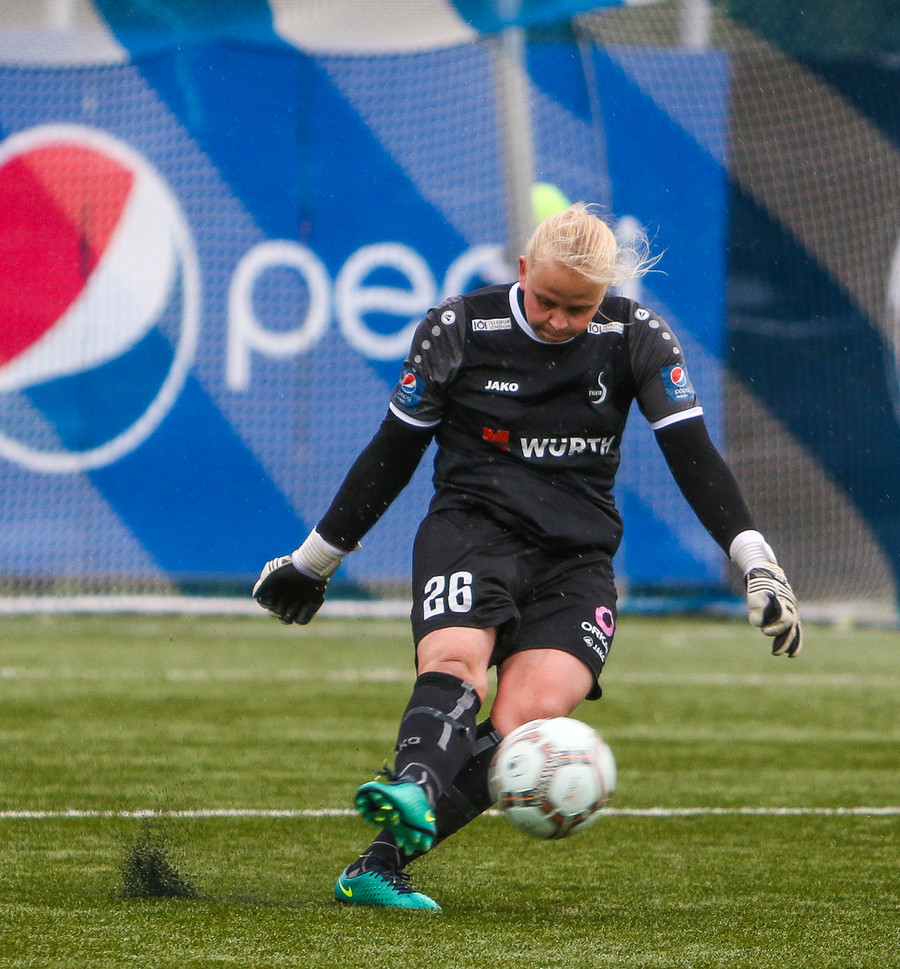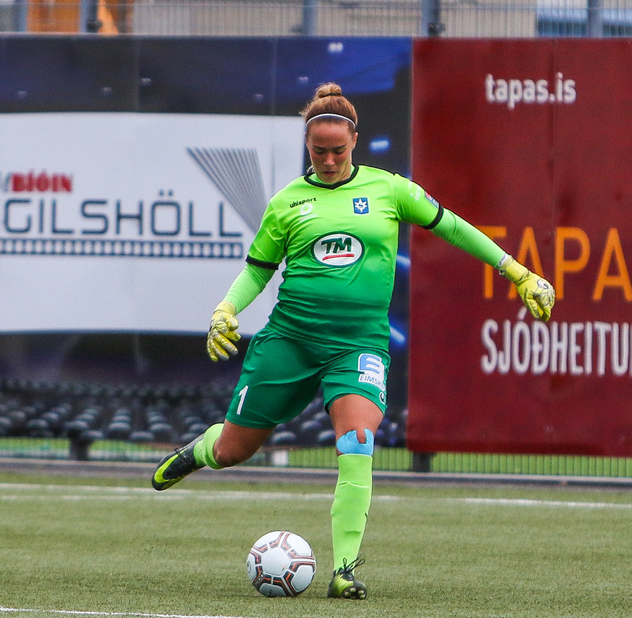 Katrín Ásbjörns tekur spyrnuna og nær frákastinu en skot hennar fer langt framhjá í vindinum.