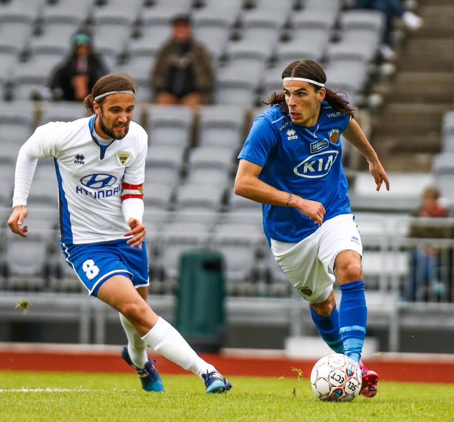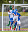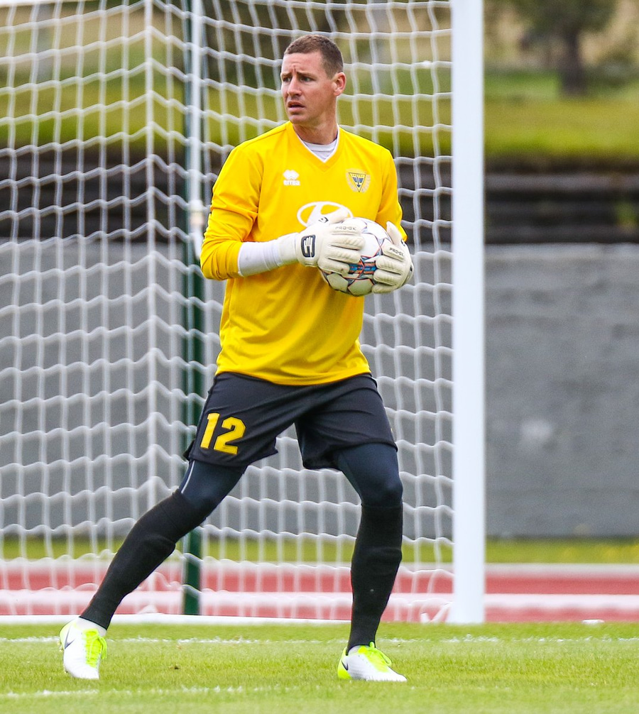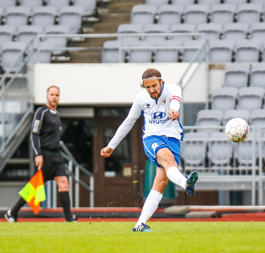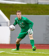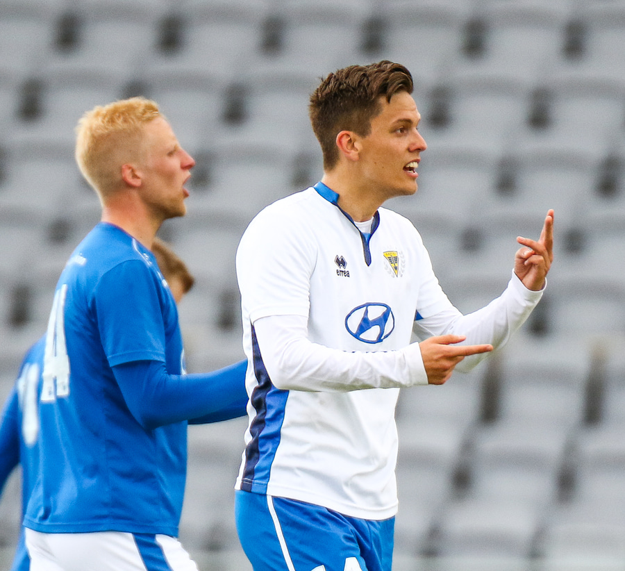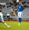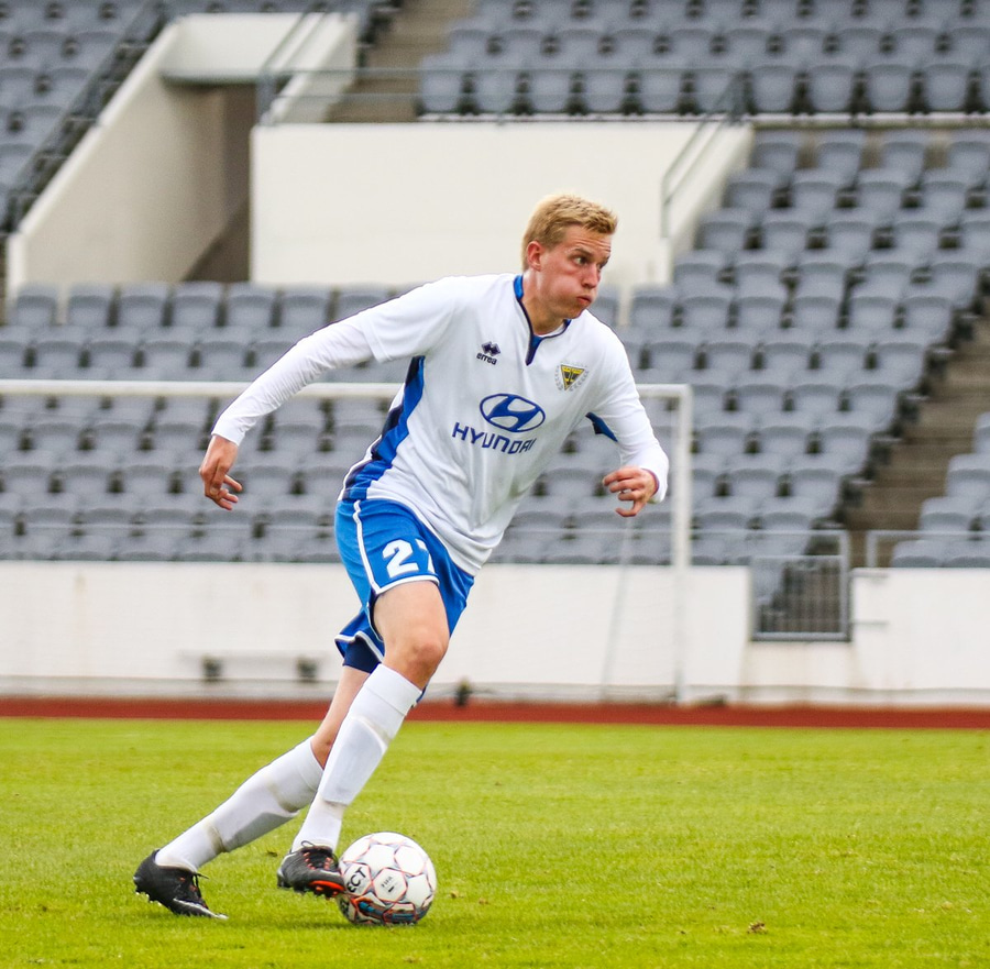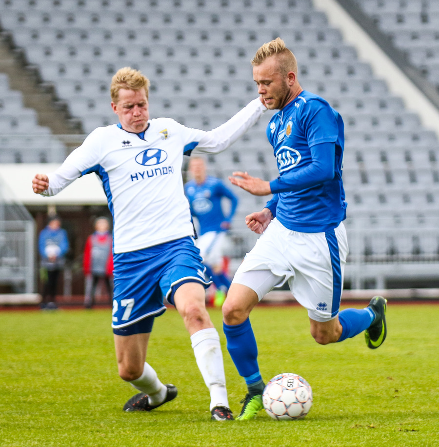 Sigurpáll Melberg fyrirliði með fyrirgjöf en Alexander Kostic bjargar í horn. Ekkert merkilegt kemur úr horninu.
